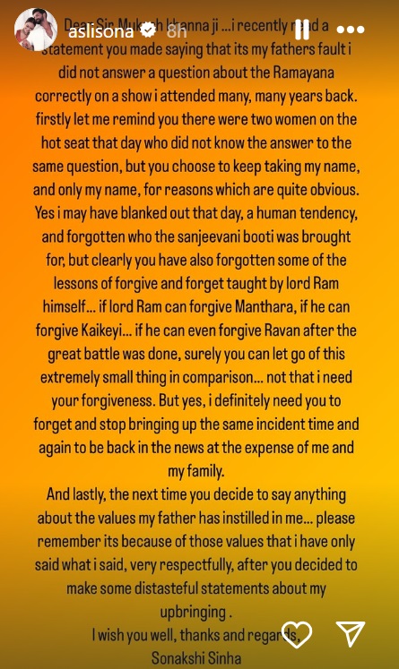 इन्स्टाग्राम स्टोरीवर पोस्ट शेअर करत सोनाक्षी म्हणाली, ‘नुकताच मी तुमचं वक्तव्य ऐकलं… ज्यामध्ये मी रामायणासंबंधी चुकीचं उत्तर दिल्यामुळे तुम्हा माझ्या वडिलांना जबाबदार ठरवलं…सर्व प्रथम, मी तुम्हाला आठवण करून देऊ इच्छितो की त्या दिवशी शोमध्ये दोन महिला होत्या ज्यांच्याकडे या प्रश्नाचे अचूक उत्तर नव्हतं, परंतु तुम्ही फक्त माझं नाव घेतलं. यावरून तुमचा वाईट हेतू स्पष्टपणे दिसून येतो.’