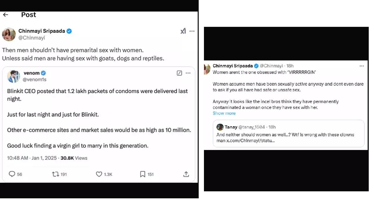 या पोस्टवरून युजरला सुनावत चिन्मयी श्रीपदाने लिहिलं, ‘मग पुरुषांनी लग्नाच्या आधीच स्त्रियांसोबत सेक्स करू नये. जोपर्यंत पुरुष शेळ्या, कुत्रे आणि सरपटणारे प्राणी यांच्याशी संभोग करत नसतील. महिलांना व्हर्जिन या शब्दाचं वेड नाही. पुरुष हे तसेही लैंगिकदृष्ट्या सक्रिय असतात असं महिलांना वाटतं आणि तुम्हा सर्वांनी सुरक्षित किंवा असुरक्षित सेक्स केलंय का हे विचारण्याची हिंमतसुद्धा ते करत नाहीत. असो.. काही incel (ऑनलाइन कम्युनिटीचे असे सदस्य जे स्वत:ला लैंगिकदृष्ट्या स्त्रियांना आकर्षित करण्यास सक्षम सजमत नाहीत/ विशेषत: लैंगिकदृष्ट्या सक्रिय असलेल्या महिला आणि पुरुषांबद्दल प्रतिकूल असलेल्या विचारांशी संबंधित) बंधूंना असं वाटतं की त्यांनी एखाद्या महिलेशी सेक्स करून तिला कायमचं दूषित केलंय. त्यामुळे पुरुषांना असा काही आजार असलाच पाहिजे ज्यातून त्यांच्याशी जवळीक साधण्याचा प्रयत्न करणारी स्त्री कधीही बरी होऊ शकत नाही आणि ज्यापासून इतर पुरुष घाबरतील.’