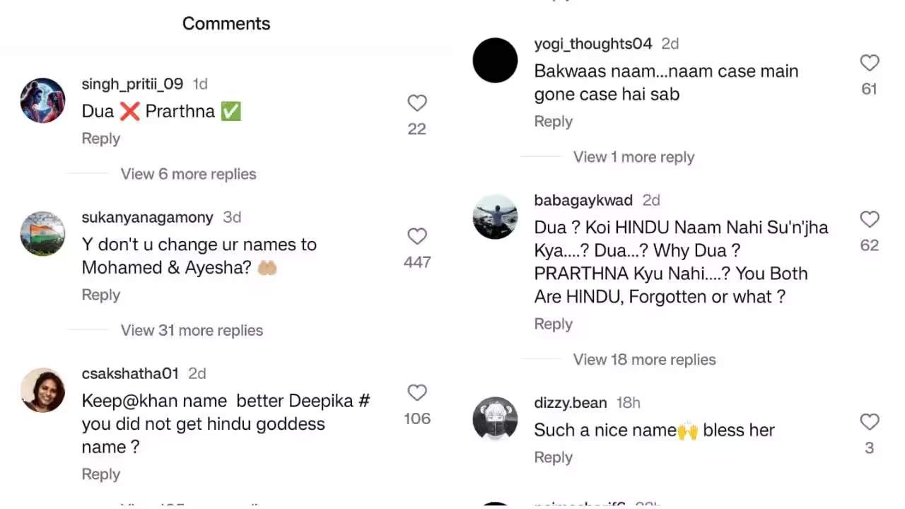 दिवाळीच्या मुहूर्तावर अभिनेत्री दीपिका पादुकोण आणि रणवीर सिंह यांनी त्यांच्या मुलीचं नाव जाहीर केलं. सोशल मीडियावर एक खास फोटो पोस्ट करत त्यांनी मुलीचं नाव ‘दुआ पादुकोण सिंह’ ठेवल्याचं म्हटलंय. दीपिकाची ही पोस्ट क्षणार्धात सोशल मीडियावर व्हायरल झाली. त्यावर नेटकरी आणि इंडस्ट्रीतील सेलिब्रिटींनी लाइक्स, कमेंट्सचा वर्षाव केला. अनेकांनी दीपिका आणि रणवीरला शुभेच्छा दिल्या. मात्र काही प्रतिक्रिया या नावावरून प्रश्न उपस्थित करणाऱ्याही होत्या. दीपिकाने तिच्या मुलीचं नाव ‘दुआ’ का ठेवलं, असा सवाल काहींनी केला. तर ‘दुआ’ नाव ठेवण्यापेक्षा ‘प्रार्थना’ हे नाव अधिक चांगलं वाटलं असतं, असंही काहीजण म्हणाले.