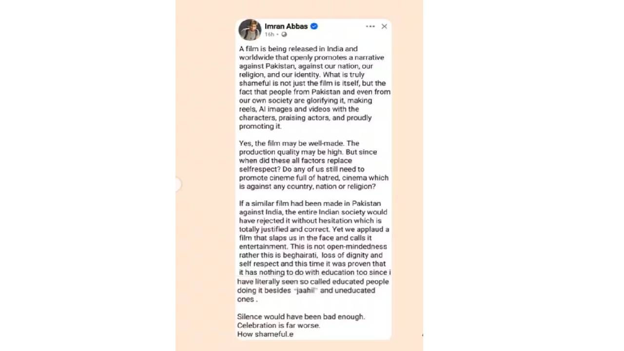 आदित्य धर दिग्दर्शित ‘धुरंधर’ या चित्रपटाने बॉक्स ऑफिसवर अक्षरश: धुमाकूळ घातला आहे. या चित्रपटाने आतापर्यंत जगभरात 600 कोटी रुपयांपेक्षा अधिक कमाई केली आहे. आश्चर्याची बाब म्हणजे या चित्रपटाचं केवळ भारतातच नाही तर पाकिस्तानमध्येही कौतुक होत आहे. अर्थात अनेक पाकिस्तानी लोकांनी ‘धुरंधर’वर टीका केली आहे. परंतु त्यातील कलाकार, त्यांचं दमदार अभिनय, प्रॉडक्शन यांची प्रशंसा करणारा वर्गही तिथे आहे. यावरूनच एका पाकिस्तानी अभिनेत्याला मिरच्या झोंबल्या आहेत. सोशल मीडियावर भलीमोठी पोस्ट लिहित त्याने पाकिस्तानी लोकांना सुनावलं आहे. या अभिनेत्याचं नाव आहे इम्रान अब्बास.