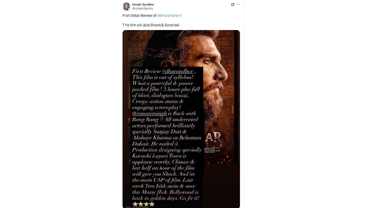 प्रसिद्ध चित्रपट समिक्षक उमैर संधूने ‘धुरंधर’चा पहिला रिव्ह्यू सांगितला आहे. हा चित्रपट पाहिल्यानंतर त्यांनी सोशल मीडियावर पोस्ट लिहिली आहे. ‘हा चित्रपट तुम्हाला शॉक आणि सरप्राइजसुद्धा देणार आहे. हा चित्रपट आऊट ऑफ सिलॅबस (चौकटीबाहेरचा) आहे. अत्यंत पॉवरफुल आणि पॉवर पॅक्ड चित्रपट आहे. तीन तासांत जबरदस्त डायलॉगबाजी, अॅक्शन स्टंट्स आणि खिळवून ठेवणारी पटकथा पहायला मिळते. रणवीर सिंहने जबरदस्त कमबॅक केला आहे. तर संजय दत्त, अक्षय खन्ना यांनी जबरदस्त स्टंट केले आहेत. क्लायमॅक्स आणि चित्रपटाच्या शेवटचा अर्धा तास तुम्हाला थक्क करतो. हेच या चित्रपटाचं वैशिष्ट्य आहे. बॉलिवूडचे सोनेरी दिवस परत आले’, असं त्यांनी या पोस्टमध्ये लिहिलंय.