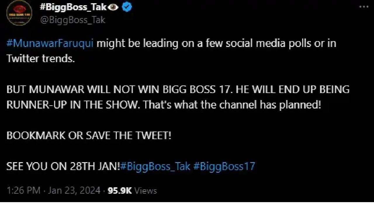 ‘बिग बॉस 17’च्या सुरुवातीपासूनच स्टँडअप कॉमेडियन मुनव्वर फारुकीचा मोठा चाहतावर्ग निर्माण झाला आहे. त्यामुळे ग्रँड फिनालेपूर्वी त्याचं नाव सोशल मीडियावर विजेतेपदासाठी जोरदार चर्चेत आहे. एक्सवर (ट्विटर) एका दिवसात मुनव्वरच्या नावाने लाखो ट्विट्स केले जात आहेत. मात्र ऐनवेळी बिग बॉसकडून विजेता बदलला जाणार असल्याचा अंदाज आहे. सोशल मीडियावर मुनव्वर जोरदार ट्रेंड होत असला तरी तो विजेता ठरणार नाही, असं कळतंय. त्याऐवजी अंतिम चुरस ही मन्नारा चोप्रा आणि अंकिता लोखंडे या दोघींमध्ये रंगणार असल्याचं समजतंय. या दोघींपैकीच कोणीतरी एक विजेता ठरणार असल्याची चर्चा रंगली आहे. तर मुनव्वर फारुकी हा रनर-अप ठरू शकतो.