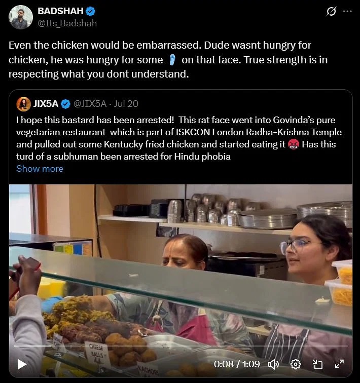 सध्या सोशल मीडियावर एक व्हिडीओ तुफान व्हायरल होत आहे, ज्यामध्ये इस्कॉनच्या शाकाहारी रेस्टॉरंटमध्ये एका व्यक्तीला चिकन खाताना पाहिल्यामुळे अनेकांनी संताप व्यक्त केला आहे. एवढंच नाही तर, बॉलिवूडचा प्रसिद्ध गायक आणि रॅपर बादशाह याने देखील सोशल मीडियावर एक पोस्ट संबंधित व्यक्तीला चांगलंच सुनावलं आहे. लंडनमधील इस्कॉनच्या राधा-कृष्ण मंदिरातील गोविंदा या शाकाहारी रेस्टॉरंटमध्ये चिकन खाणाऱ्या माणसावर रॅपर बादशाहने टीका केली आहे.