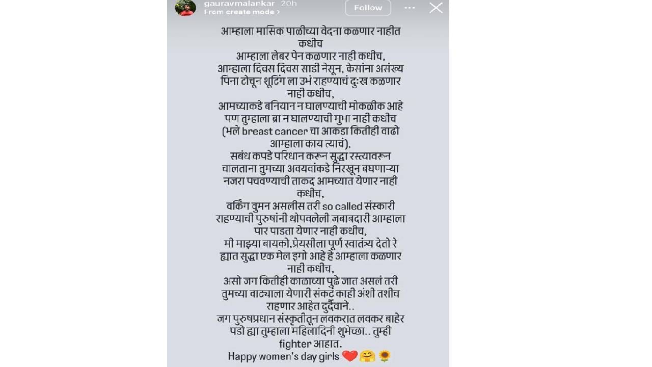 8 मार्च रोजी जगभरात महिला दिन साजरा केला जातो. जागतिक महिला दिनानिमित्त जगभरात महिलांसाठी विविध कार्यक्रम आयोजित केले जातात, सोशल मीडियावर शुभेच्छांचा वर्षाव होतो. परंतु आजही महिलांच्या बाबतीत काही परिस्थिती बदललेल्या नाहीत, ही भावना अनेकांच्या मनात कायम आहे. अभिनेता गौरव मालणकरने त्याच्या एका पोस्टद्वारे या भावनेला वाट मोकळी करून दिली आहे. महिला दिन तर साजरा होतो, पण आयुष्याच्या अनेक टप्प्यांवर महिलांना काही गोष्टी आजही सहन कराव्या लागत असल्याचं मत त्याने यातून व्यक्त केलं आहे. गौरवची ही पोस्ट सध्या सोशल मीडियावर चांगलीच चर्चेत आली आहे.