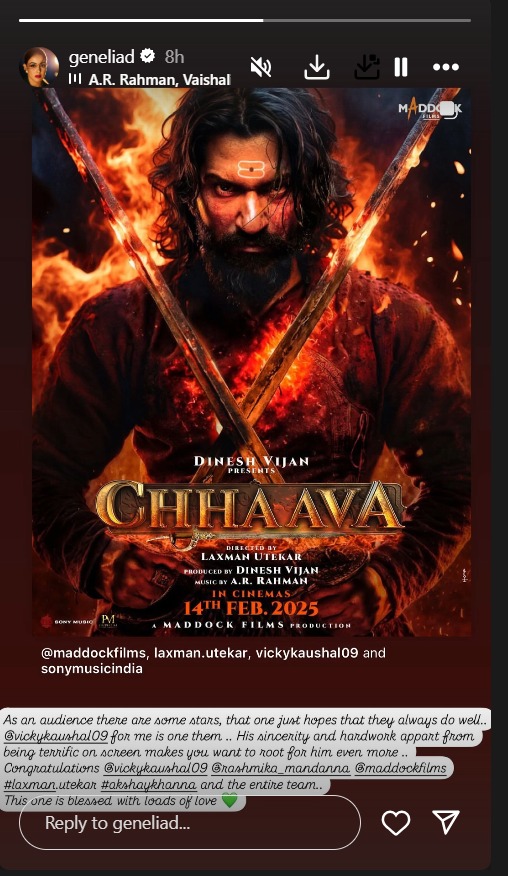 जिनिलियाने तिच्या अधिकृत इन्स्टाग्राम अकाऊंटच्या स्टोरीला ‘छावा’ सिनेमाशी संबंधीत पोस्ट शेअर केली आहे. “प्रेक्षकांसाठी असे काही कलाकार असतात ज्यांच्याकडून नेहमीच सकारात्मक अपेक्षा असतात. हे कलाकार काहीतरी चांगलंच करणार असे वाटत असते. विकी कौशल माझ्यासाठी तसा अभिनेता आहे. त्याची मेहनत, जिद्द, प्रामाणिकपणा खूप काही सांगून जातो. ऑनस्क्रीन विकी ज्याप्रकारे भूमिका साकारतो, यात त्याने घेतलेली मेहनत दिसून येत आहे. खूप अभिनंदन विकी कौशल, रश्मिका मंदाना, मॅडडॉक फिल्म्स, लक्ष्मण उतेकर, अक्षय खन्ना आणि या चित्रपटाच्या संपूर्ण टीमचं खूप अभिनंदन! तुम्हाला सर्वांना खूप खूप प्रेम” या आशयाची ही पोस्ट आहे.