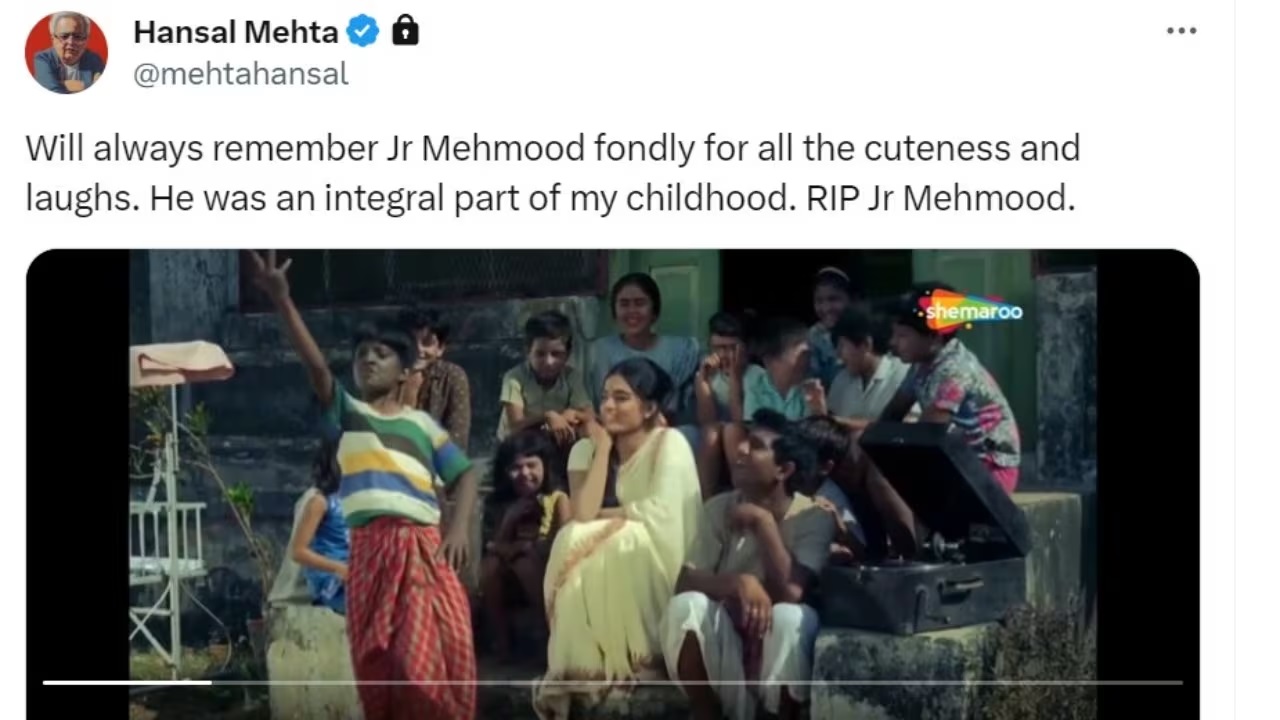 ज्युनियर महमूद यांच्या निधनामुळे चाहते आणि अनेक सेलिब्रिटींना धक्का बसला आहे. अनेक जण ज्युनियर महमूद यांच्या निधनानंतर दुःख देखील व्यक्त करत आहेत. आता ज्युनियर महमूद यांचे खास मित्र आणि दिग्दर्शक हंसल मेहता यांनी सोशल मीडिया पोस्ट करत दुःख व्यक्त केलं आहे.