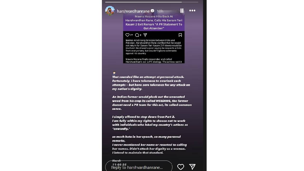 भारत-पाकिस्तानदरम्यान तणावाचं वातावरण असताना आता बॉलिवूड अभिनेता हर्षवर्धन राणे आणि पाकिस्तानी अभिनेत्री मावरा होकेन यांच्यात शाब्दिक चकमक सुरू झाली आहे. या दोघांनी 2016 मध्ये प्रदर्शित झालेल्या ‘सनम तेरी कसम’ या चित्रपटात मुख्य भूमिका साकारल्या होत्या. त्यातील दोघांची केमिस्ट्री प्रेक्षकांना खूप आवडली होती. परंतु पहलगाम हल्ल्याला प्रत्युत्तर म्हणून भारताने राबवलेल्या ऑपरेशन सिंदूरवर मावराने टीका केल्यानंतर हर्षवर्धनसुद्धा शांत बसला नाही. त्याने थेट ‘सनम तेरी कसम’च्या सीक्वेलमध्ये पाकिस्तानी कलाकारांसोबत काम करणार नसल्याचं जाहीर केलं. यानंतर मावरानेही त्याच्यावर पलटवार केला. हर्षवर्धनने हे वक्तव्य फक्त प्रसिद्धीसाठी केल्याची टीका तिने केली. यानंतर आता हर्षवर्धनने मावरासाठी भलीमोठी पोस्ट लिहिली आहे.