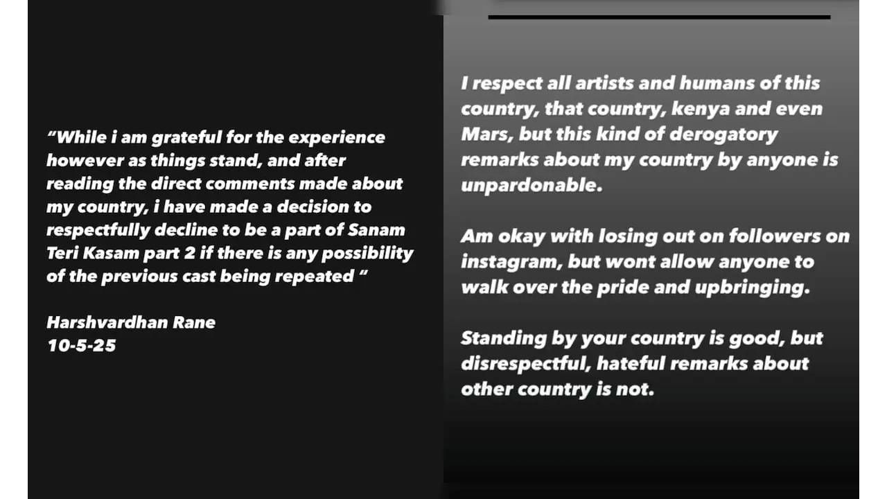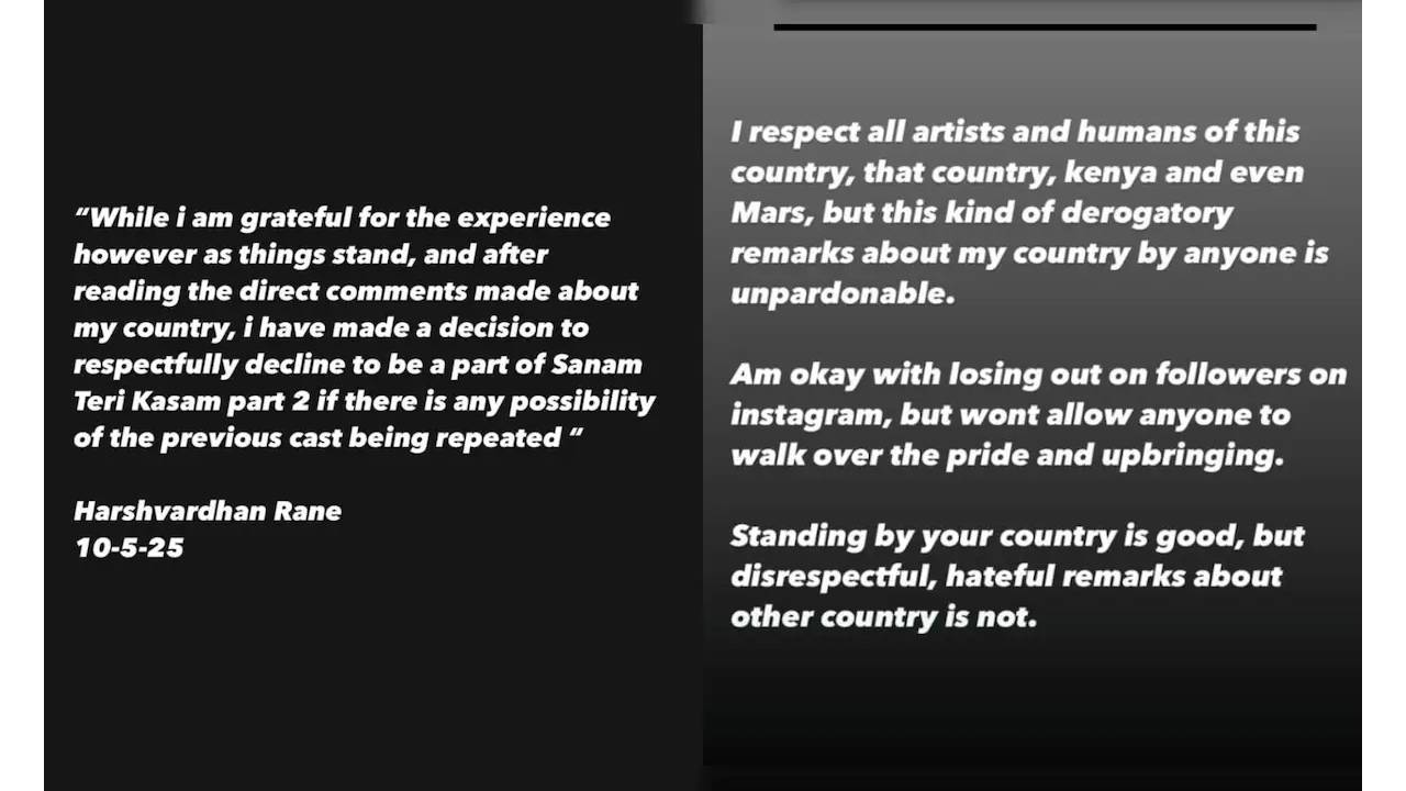 ऑपरेशन सिंदूरनंतर अभिनेता हर्षवर्धन राणेनं शपथ घेतली आहे. 'सनम तेरी कसम'च्या सीक्वेलमध्ये त्याच कलाकारांसोबत पुन्हा काम करणार नाही, असं त्याने स्पष्ट केलंय. हर्षवर्धनच्या या निर्णयाचं भारतीयांकडून कौतुक होत आहे.