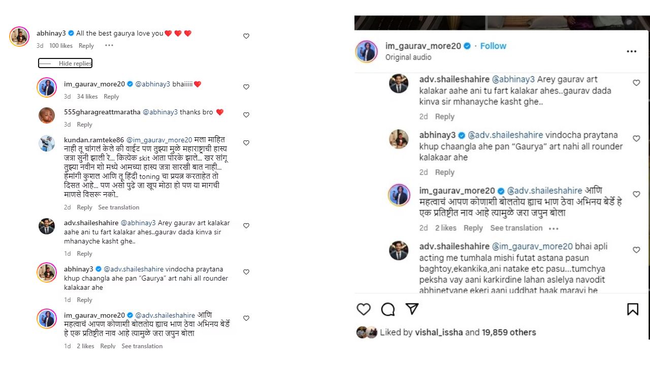गौरवच्या पोस्टवर कमेंट करत अभिनयने लिहिलं, ‘ऑल द बेस्ट गौऱ्या, लव्ह यू!’ अभिनयने गौरवचा उल्लेख ‘गौऱ्या’ असा केला म्हणून एका युजरने नाराजी व्यक्त केली. ‘अरे गौरव आर्ट कलाकार आहे आणि तू फार्ट कलाकार आहेस. गौरव दादा किंवा सर म्हणायचे कष्ट घे’, असं त्याने लिहिलं. त्यावर अभिनयने संबंधित युजरला उत्तर देताना म्हटलं, ‘विनोदाचा प्रयत्न खूप चांगला आहे पण ‘गौऱ्या’ आर्ट नाही ऑल राऊंड कलाकार आहे.’
