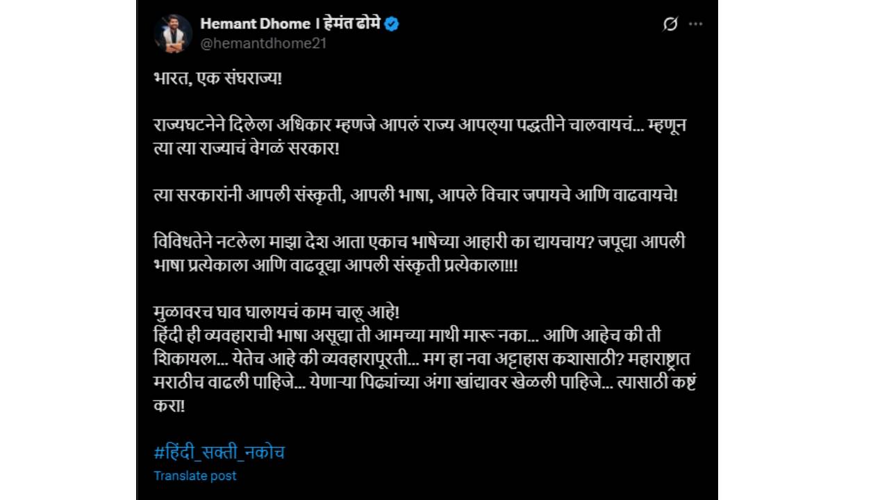 ‘भारत, एक संघराज्य! राज्यघटनेने दिलेला अधिकार म्हणजे आपलं राज्य आपल्या पद्धतीने चालवायचं.. म्हणून त्या त्या राज्याचं वेगळं सरकार. त्या सरकारांनी आपली संस्कृती, आपली भाषा, आपले विचार जपायचे आणि वाढवायचे. विविधतेने नटलेला माझा देश आता एकाच भाषेच्या आहारी का द्यायचाय? जपू द्या आपली भाषा प्रत्येकाला आणि वाढवू द्या आपली संस्कृती प्रत्येकाला. मुळावरच घाव घालायचं काम चालू आहे. हिंदी ही व्यवहाराची भाषा असू द्या. ती आमच्या माथी मारू नका आणि आहेच की ती शिकायला. येतेच आहे की व्यवहारापुरती. मग हा नवा अट्टाहास कशासाठी? महाराष्ट्रात मराठीच वाढली पाहिजे. येणाऱ्या पिढ्यांच्या अंगा-खांद्यावर खेळली पाहिजे, त्यासाठी कष्ट करा,’ अशी पोस्ट हेमंतने लिहिली आहे. या पोस्टच्या अखेरीस त्याने #हिंदी_सक्ती_नकोच असा हॅशटॅग जोडला आहे.
