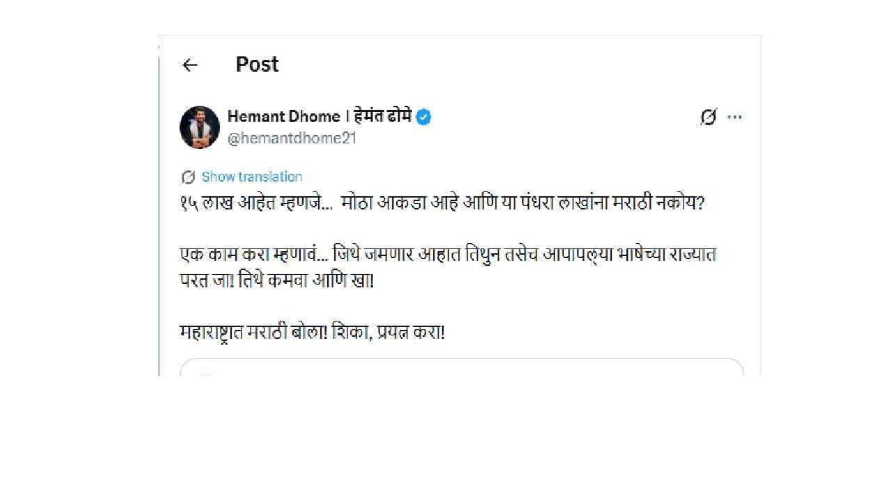 ’15 लाख आहेत म्हणजे.. मोठा आकडा आहे आणि या पंधरा लाखांना मराठी नकोय? एक काम करा म्हणावं.. जिथे जमणार आहात तिथून तसेच आपापल्या भाषेच्या राज्यात परत जा. तिथे कमवा आणि खा. महाराष्ट्रात मराठी बोला. शिका, प्रयत्न करा,’ अशी पोस्ट हेमंतने लिहिली आहे. मराठी भाषा टिकली पाहिज, जगली पाहिजे आणि वाढली पाहिजे.. अशी हेमंतची आधीपासूनचीच भूमिका आहे. याच भूमिकेतून त्याने ‘क्रांतिज्योती विद्यालय: मराठी माध्यम’ हा मराठी शाळांबद्दलचा आशयघन आणि तितकाच मनोरंजक चित्रपट बनवला होता. त्यामुळे भाषा सक्तीविरोधात संपावर जाण्याला त्याने ठाम विरोध केला आहे.