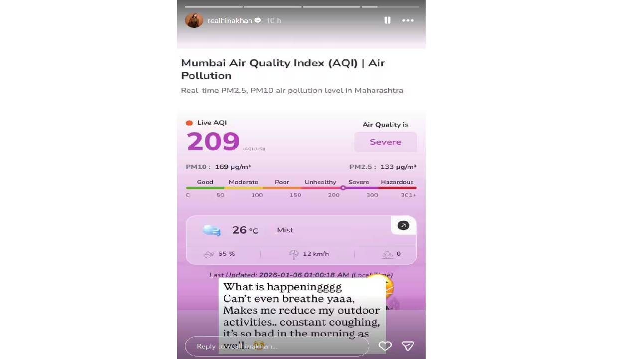 हिनाने तिच्या इन्स्टाग्राम स्टोरीवर मुंबईच्या एअर क्वालिटी इंडेक्सचा (AQI) स्क्रीनशॉट शेअर केला आहे. या स्क्रीनशॉटमध्ये शहराचा AQI 209 वर दाखवण्यात आला आहे. म्हणजेच हवेची गुणवत्ता अत्यंत खराब आहे. या पोस्टच्या कॅप्शनमध्ये हिनाने लिहिलंय, ‘काय चाललंय? मला श्वास घेता येत नाहीये. मी बाहेर जाणं कमी केलंय. मला सतत खोकला येतोय. सकाळपासून खूप वाईट वातावरण आहे.’