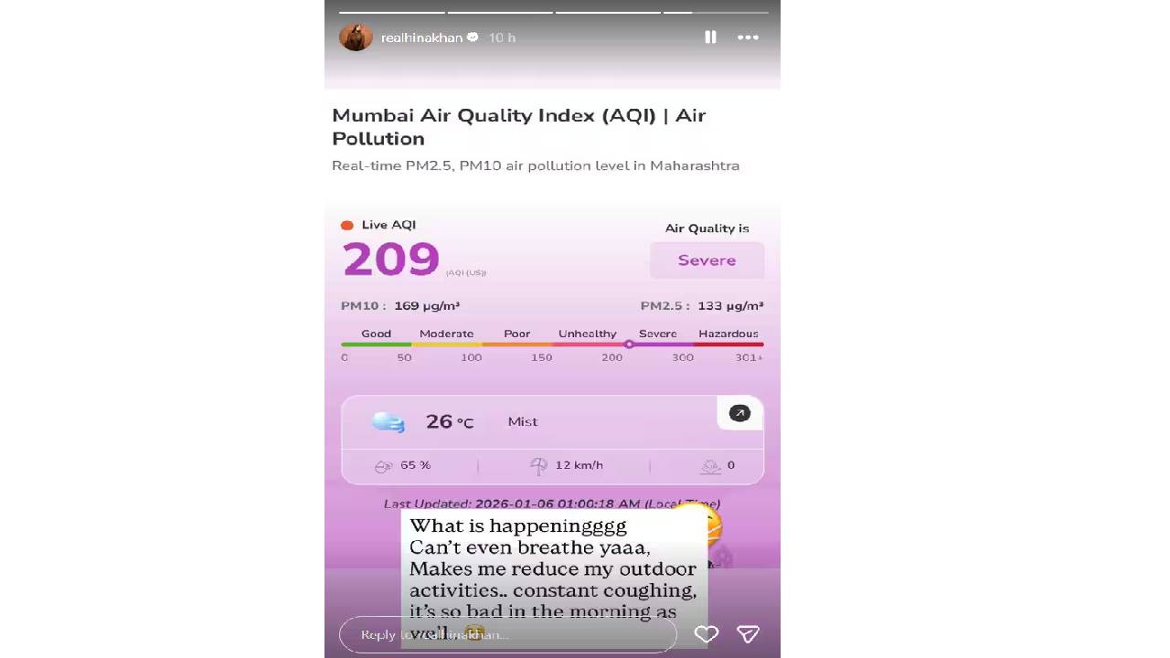 हिनाने हवेचा गुणवत्ता निर्देशांक पोस्ट करत त्यावर लिहिलंय, ‘मुंबईत खालावत जाणाऱ्या हवेच्या गुणवत्तेमुळे मला श्वास घेण्यास त्रास होत आहे. प्रदूषणामुळे मला सतत खोकला आणि कफ होतोय. या सर्वांचा माझ्या आरोग्यावर विपरीत परिणाम होतोय. ब्रेस्ट कॅन्सरशी झुंज दिल्यानंतर हे माझ्यासाठी आणखी आव्हानात्मक बनतंय. प्रदूषित हवेमुळे मला बाहेरच्या शारीरिक हालचाली कमी कराव्या लागत आहेत. त्याच्या माझ्या लाइफस्टाइलवर परिणाम होत आहे.’