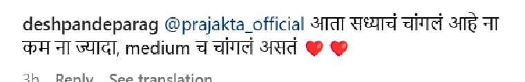 अशी पोस्ट प्राजक्ताने केली आहे. तिच्या या पोस्टवरून सध्या तिचं वजन 51 किलो असल्याचं स्पष्ट झालं आहे.मात्र यापुढे भविष्यात आपलं वजन 50 वर आणण्याचं तिचं टार्गेट आहे. तिच्या या पोस्टवक चाहत्यांनी नेहमीप्रमाणे लाईक्स आणि कमेंट्सचा पाऊस पाडलाय. काहींनी तर एकाहून एक भन्नाट कमेंट्सही केल्या आहेत. प्रामाणिकपणे, सांगू तू खूप सुंदर आहेस,असं तिच्या एका चाहत्याने लिहीलं आहे. तर 53 पाहिजे प्राजु मॅडम, खूप भारी वाटतात अशी मागणी दुसऱ्याने कमेंटमधून केली आहे. आता सध्याचं चांगलं आहे ना कम ना ज्यादा, medium च चांगलं असतं असंही एकाने लिहीलं. प्राजक्ता, तुझं हे वजन कितीही असलं तरी प्रेक्षकांच्या मनातलं वजन मात्र कायम वरचढ ठरेल अशी भन्नाट कमेंटही एका युजरने केली आहे.
