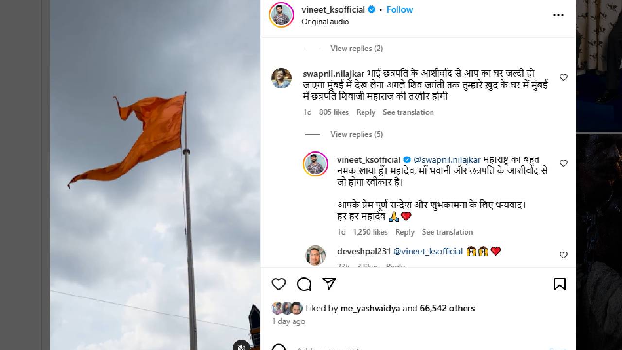 छत्रपती शिवाजी महाराजांच्या जयंतीदिनी विनीतने त्याच्या इन्स्टाग्राम अकाऊंवर एक व्हिडीओ पोस्ट केला होता. चित्रपटाची शूटिंग सुरू करण्यापूर्वा तुळापूर इथं भेट दिल्याचा त्याचा हा व्हिडीओ आहे. या व्हिडीओवर नेटकऱ्यांनी भरभरून प्रतिक्रिया दिल्या आहेत. त्यातच एका युजरने घर घेण्याबद्दल कमेंट केली. ‘भावा, छत्रपती शिवाजी महाराजांच्या आशीर्वादाने तुझं मुंबईत लवकरच हक्काचं घर होईल. पुढच्या शिवजयंतीला तुझ्या मुंबईतील स्वत:च्या घरात छत्रपती शिवाजी महाराजांचा फोटो असेल’, असं संबंधित युजरने लिहिलं. त्यावर विनीतने उत्तर देत म्हटलंय, ‘महाराष्ट्राचं मी खूप मीठ खाल्लंय. महादेव, आई भवानी आणि छत्रपती शिवाजी महाराजांच्या आशीर्वादाने जे होईल ते मला स्वीकार असेल. तुम्हा सर्वांच्या प्रेमळ संदेशासाठी आणि शुभेच्छांसाठी धन्यवाद. हर हर महादेव!’