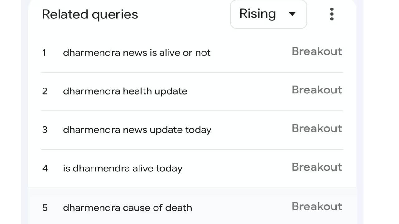 धर्मेंद्र यांच्याविषयी पाच गोष्टी सर्वाधिक सर्च करण्यात आल्या आहेत. त्यापैकी सर्वांत जास्त विचारला गेलेला किंवा सर्च केलेला प्रश्न म्हणजे धर्मेंद्र जिवंत आहेत की नाहीत? कारण ब्रीच कँडी रुग्णालयात उपचार सुरू असताना सोशल मीडियावर त्यांच्या निधनाची अफवा पसरली होती. नंतर हेमा मालिनी आणि ईशा देओल यांनी सोशल मीडियावर पोस्ट लिहित या अफवांना खोटं म्हटलं होतं.