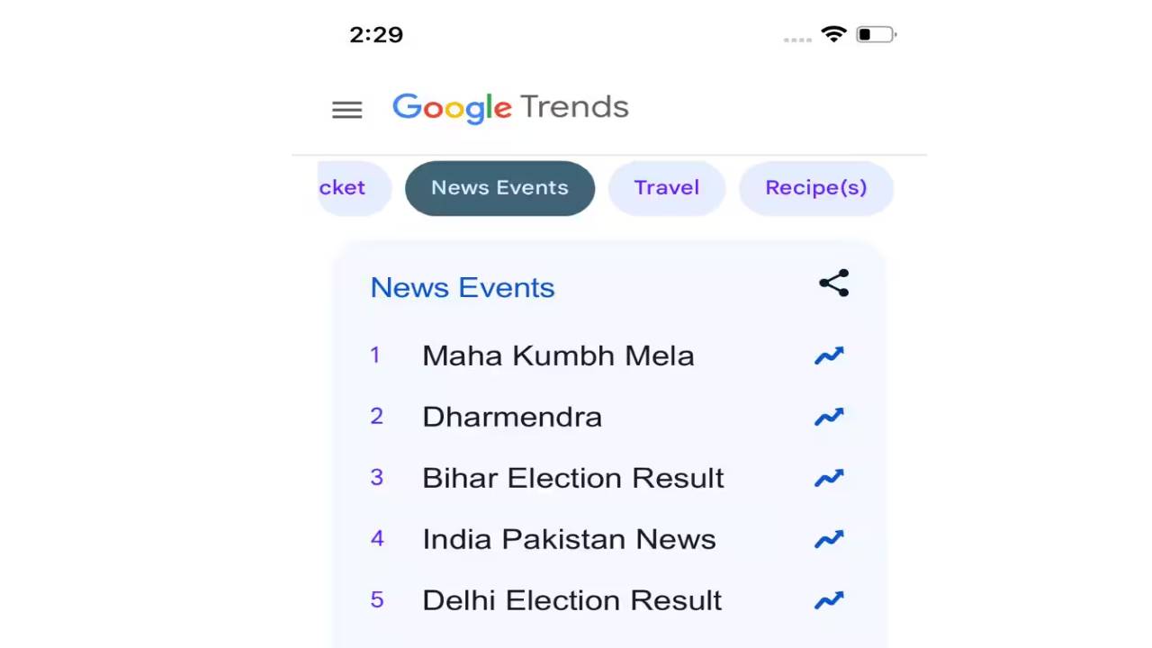 या यादीत पहिल्या क्रमांकावर महाकुंभ मेळा आहे. त्यानंतर धर्मेंद्र आणि तिसऱ्या क्रमांकावर बिहार निवडणुका आहेत. चौथ्या क्रमाकांवर भारत-पाकिस्तानबद्दल सर्च करण्यात आलं. तर पाचव्या स्थानी दिल्ली निवडणुकांचा निकाल आहे.
