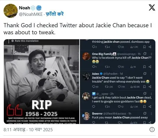 दुसऱ्या एका पोस्टमध्ये दावा केला गेला, “71 वर्षीय जॅकी चॅन यांना काही वर्षांपूर्वी लागलेल्या जखमेमुळे काही त्रास झाला आणि नंतर त्यांचे निधन झाले. हॉलिवूड लीजेंड्सनी त्यांना श्रद्धांजली दिली आहे आणि कुटुंबानेही याची पुष्टी केली आहे.” पण दुसरीकडे अनेक युजर्सनी फेक न्यूज पसरवणाऱ्यांना चांगलेच फटकारले आहेत. एका युजर्सने लिहिले, “फेसबुक जॅकी चॅन यांना का मारायचे आहे?” एकाने लिहिले, “आज इंटरनेट जॅकी चॅन यांना मारण्याचा प्रयत्न करत आहे.”