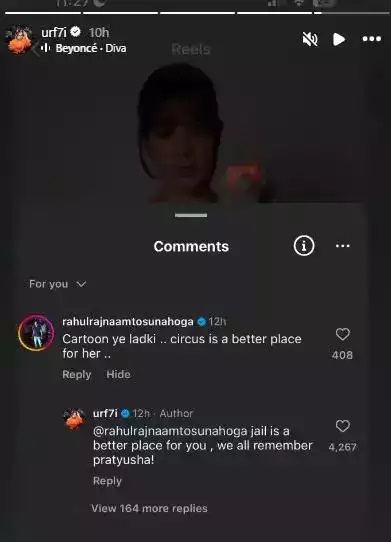 राहुलच्या कमेंटवर उत्तर देत उर्फी म्हणाली, ‘तुझ्यासाठी तुरुंग उत्तम जागा आहे. आम्ही अद्याप प्रत्युषाला विसरलो नाही..’ यावर राहुल म्हणाला, ‘तू तर मनावर घेतलंय, मी तर कौतुक करत होतो… लोकं सर्कससाठी तिकिट विकत घेतात.’ सध्या सर्वत्र उर्फा जावेद आणि राहुल राज याची चर्चा रंगली आहे.