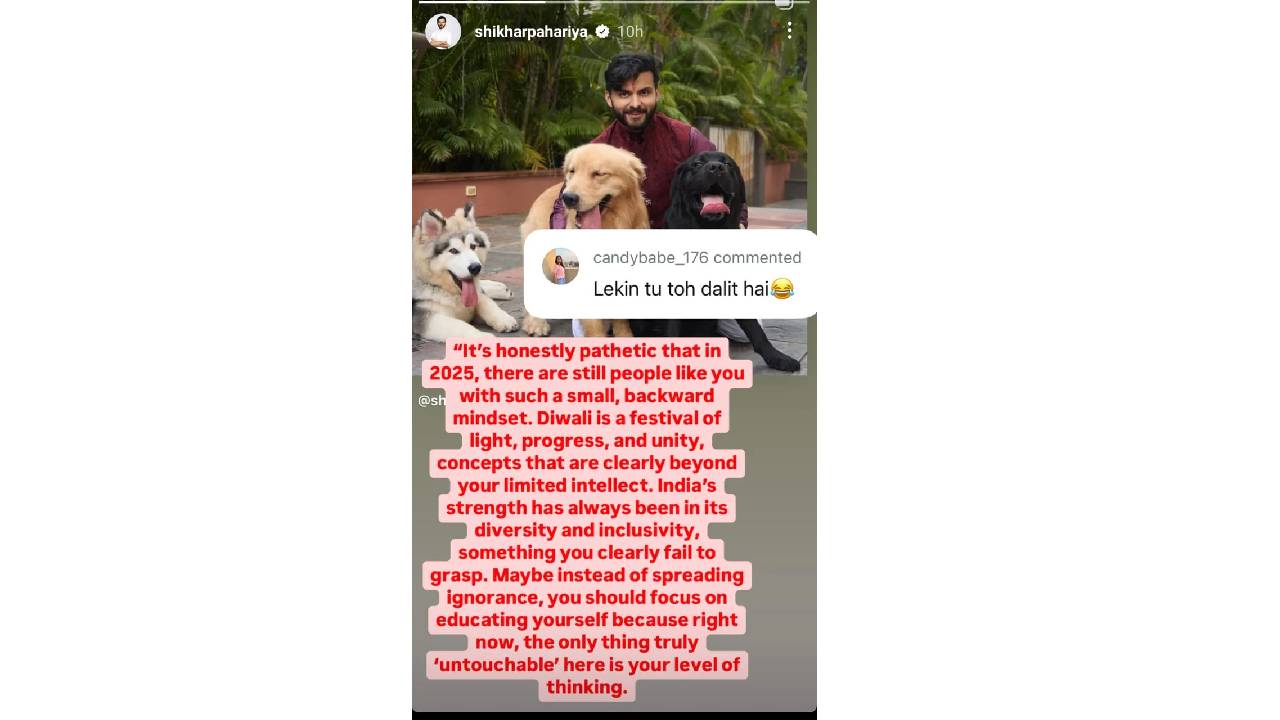 इन्स्टाग्राम स्टोरीमध्ये शिखरने लिहिलं, ‘2025 मध्येही तुझ्यासारखे इतक्या लहान, मागासलेल्या विचारसरणीचे लोक आहेत, हे खरंच दुर्दैवी आहे. दिवाळी हा प्रकाश, प्रगती आणि एकता-संकल्पनांचा उत्सव आहे, जो तुझ्या मर्यादित बुद्धीच्या पलीकडचा आहे. भारताची ताकद नेहमीच त्याच्या विविधतेत आणि सर्वसमावेशकतेत राहिली आहे, जे अर्थातच तुला समजलं नाही. अशा पद्धतीचं अज्ञान पसरवण्याऐवजी तू स्वत:ला शिक्षित करण्यावर लक्ष केंद्रीत केलं पाहिजे. कारण सध्या इथं खरोखरं अस्पृश्य असलेली एकमेव गोष्ट म्हणजे तुझ्या विचारसरणीची पातळी आहे.’