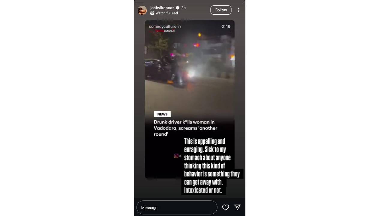 बडोदा कार अपघाताची बातमी इन्स्टाग्राम स्टोरीमध्ये शेअर करत त्यावर जान्हवीने लिहिलं, ‘हे भयावह आणि संतापजनक आहे. अशा प्रकारच्या वागण्याने सुटका होईल असं कोणालाही वाटणंच मला त्रासदायक वाटतंय. मग ती व्यक्ती नशेत असो वा नसो.’ बडोदा कार अपघातातील मृत महिलेचं नाव हेमाली पटेल असं आहे. चौरसिया मूळचा उत्तर प्रदेशातील वाराणसीचा रहिवासी आहे. तो कायद्याचा विद्यार्थी असून पेईंग गेस्ट म्हणून एका ठिकाणी राहत होता. ही कार त्याचा मित्र मित चौहानची होती, जो चालकाच्या बाजूच्या आसनावर बसला होता. अपघातानंतर तो पळून गेला, असं पोलिसांनी सांगितलं. पोलीस मितचा शोध घेत आहेत.