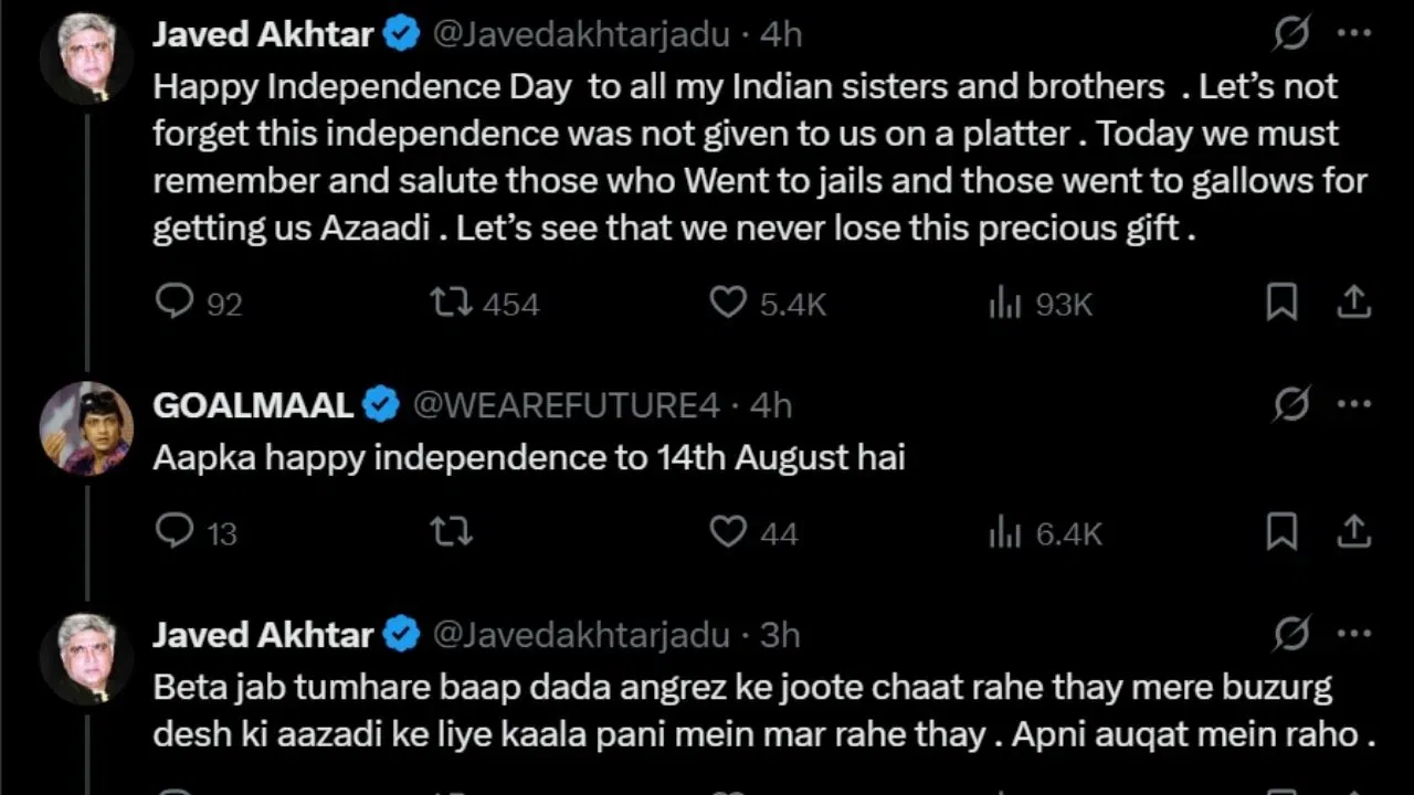 — Javed Akhtar (@Javedakhtarjadu) August 15, 2025