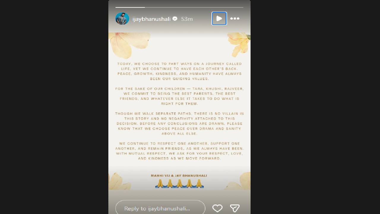 टेलिव्हिजनवरील सर्वांत लोकप्रिय जोडी जय भानुशाली आणि माही विज यांनी अधिकृतरित्या घटस्फोट घेतला आहे. गेल्या काही महिन्यांपासून त्यांच्या विभक्त होण्याच्या जोरदार चर्चा होत्या. अखेर दोघांनी एकत्र स्टेटमेंट देत घटस्फोट घेतल्याचं जाहीर केलं. इन्स्टाग्राम स्टोरीमध्ये जय आणि माहीने एकत्र स्टेटमेंटची पोस्ट शेअर केली आहे. घटस्फोटानंतरही आम्ही एकमेकांचे चांगले मित्र राहू आणि या कथेत कोणीच ‘विलेन’ नाही, असं त्यांनी स्पष्ट केलंय. लग्नाच्या तब्बल 14 वर्षांनंतर जय आणि माही विभक्त झाले आहेत. या दोघांना तीन मुलं आहेत. गेल्या काही वर्षांपासून या दोघांच्या नात्यात समस्या होत्या. दोघांनीही आपलं नातं वाचवण्यासाठी बरेच प्रयत्न केले. परंतु या प्रयत्नांना यश मिळालं नाही. अखेर त्यांनी घटस्फोटाचा निर्णय घेतला. या दोघांनी काही महिन्यांपूर्वीच घटस्फोटासाठी अर्ज केला होता. तेव्हापासून दोघं वेगवेगळे राहत होते.