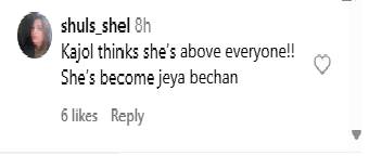 एकंदरच युजर्नसा काजोलचं हे वागणं खूप खटकल्याचं दिसत असून हा व्हिडिओ व्हायरल होत आहे. काजोलच्या या वागण्यामुळे तो खूप शेअर केला जात आहे. हजारो लोकांनी हा व्हिडिओ लाईकही करत त्यावर कमेंट्स केल्या आहेत.