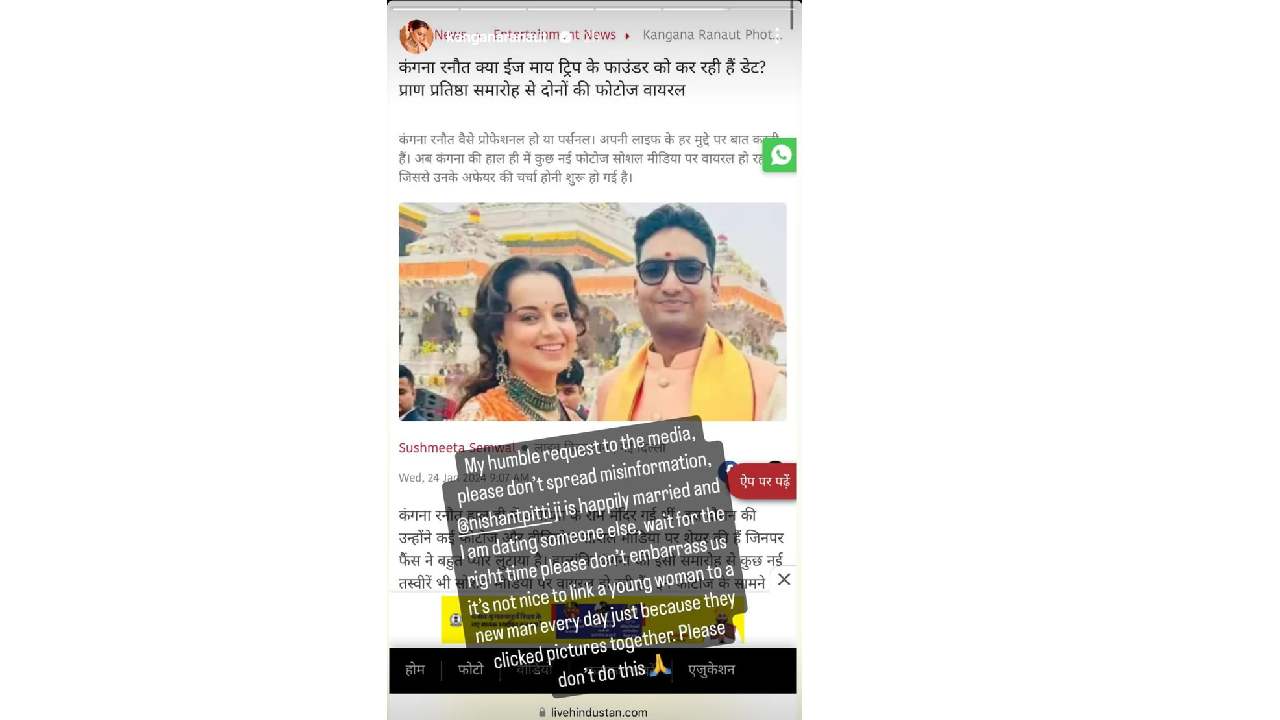 बुधवारी कंगनाने इन्स्टाग्राम स्टोरीमध्ये एका वृत्ताचा स्क्रीनशॉट शेअर केला. कंगना आणि निशांत एकमेकांना डेट करत असल्याचं ते वृत्त होतं. त्यावर तिने लिहिलं, ‘मीडियाला माझी नम्र विनंती आहे की कृपया चुकीची माहिती पसरवू नका. निशांत पिट्टीजी यांचं लग्न झालेलं आहे आणि मी दुसऱ्या व्यक्तीला डेट करतेय. योग्य वेळेची प्रतीक्षा करा आणि कृपया आम्हाला लाजिरवाणं वाटेल असं काही करू नका.’ कंगनाने पहिल्यांदाच अशा पद्धतीने तिच्या रिलेशनशिपचा खुलासा केला आहे. मात्र ती कोणाला डेट करतेय, हे अद्याप तिने सांगितलं नाही. या पोस्टमध्ये तिने पुढे लिहिलंय, ‘फक्त सोबत फोटो क्लिक केल्यामुळे एका तरुण महिलेला दररोज एका नव्या पुरुषाशी जोडणं बरोबर नाही. कृपया असं करू नका.’ या पोस्टच्या अखेरीस तिने हात जोडलेले इमोजी पोस्ट केले आहेत.