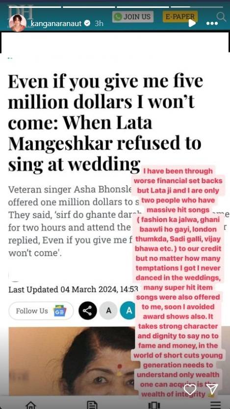 पोस्टसोबत कंगना राणावत हिने लता मंगेशकर यांची एक मुलाखत शेअर केलीये. या मुलाखतीमध्ये लता मंगेशकर यांनी म्हटले की, मला कोणी जरी पाच लाख डॉलर्स दिले तरी मी येणार नाही. या पोस्टमध्ये कंगना राणावत ही आपली आणि लता मंगेशकरची बरोबरी करताना दिसत आहे. कंगना म्हणते की, मला कोणीही करोडो रूपये दिले तरीही मी कोणाच्या कार्यक्रमात परफॉर्म नाही करणार.