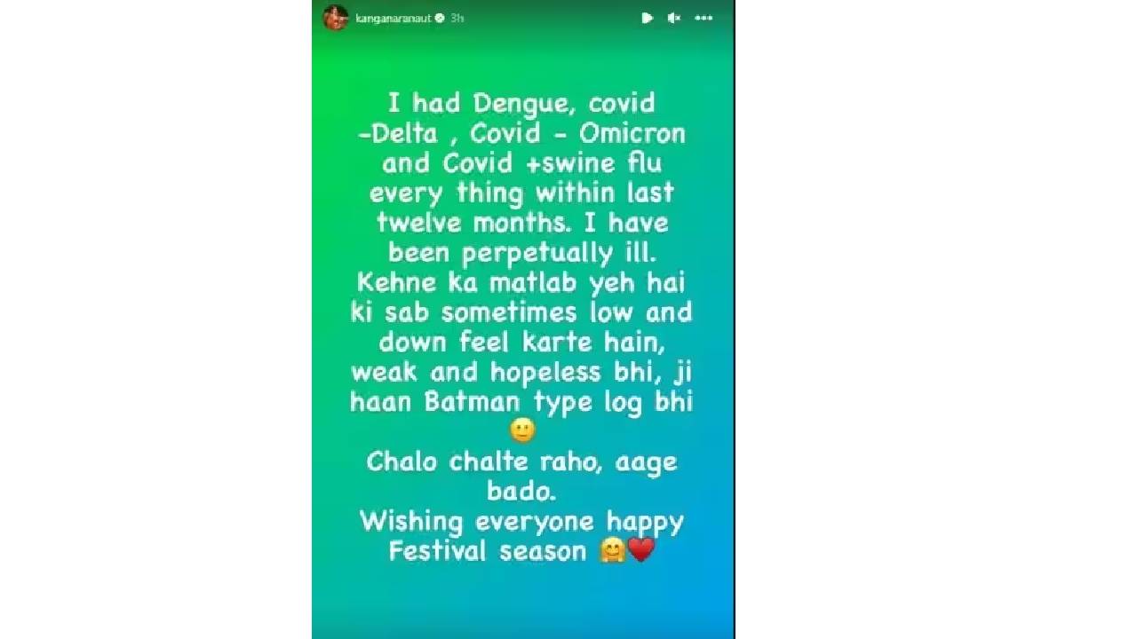 कंगनाने लिहिलं, ‘गेल्या बारा महिन्यांपासून मला डेंग्यु, कोविड, डेल्टा, कोविड-ओमिक्रॉन आणि कोविड प्लस स्वाइन फ्लू हे सर्वकाही झालंय. मी सतत आजारी आहे. मला इतकंच म्हणायचं आहे की प्रत्येकाला कधी ना कधी खचल्यासारखं वाटतं. कमजोर पडल्यासारखं आणि निराश झाल्यासारखं वाटतं. बॅटमॅनसारख्या लोकांनाही असं वाटू शकतं. चला चालत राहुयात, पुढे जात राहुयात. सर्वांना उत्सवानिमित्त शुभेच्छा.’ कंगनाच्या या पोस्टवर चाहत्यांनी काळजी व्यक्त केली.