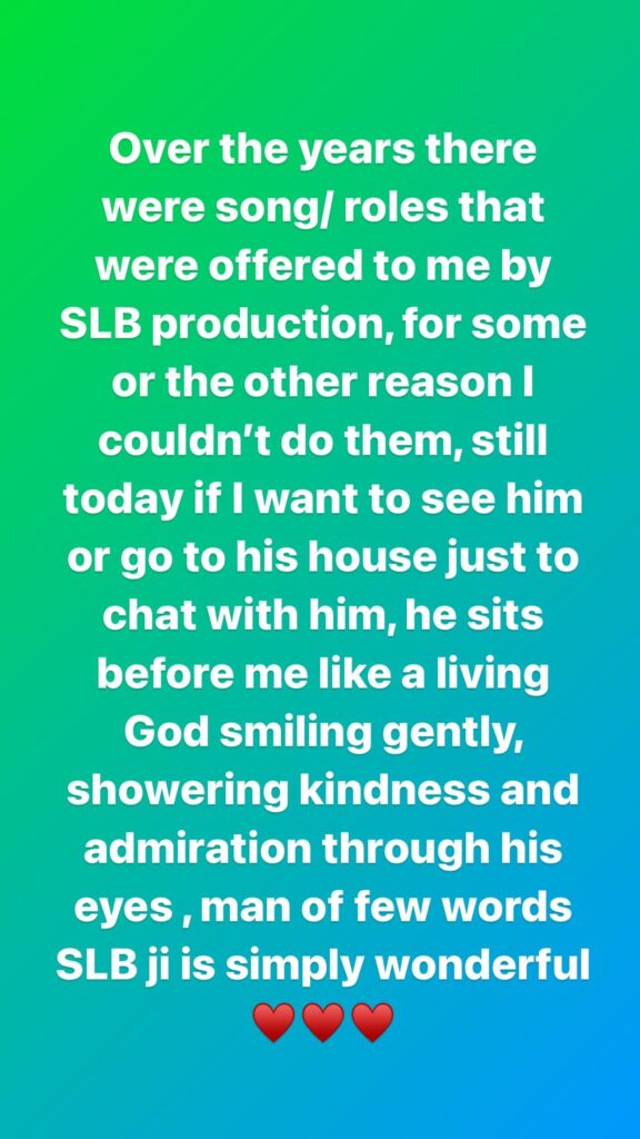 गेल्या काही वर्षांत मला संजय लीला भन्साळी प्रॉडक्शनकडून अनेक गाणी आणि भूमिका ऑफर करण्यात आल्या, परंतु काही कारणांमुळे मी ते करू शकले नाही. आताही जेव्हा मी त्यांना भेटायला त्याच्या घरी जातो तेव्हा ते माझ्याशी बसून बोलता. देवासारखे हळूवारपणे हसणारे, दयाळूपणे, मृदू बोलणारे SLB जी अगदी अप्रतिम आहेत, असेही कंगनाने पुढे नमूद केले आहे.