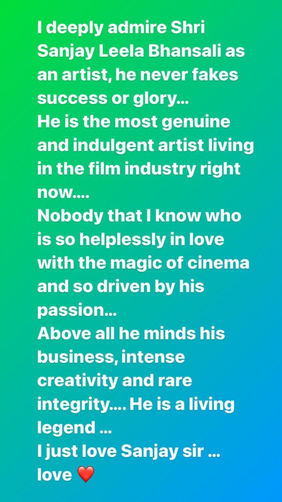 ‘मी एक कलाकार म्हणून श्री. संजय लीला भन्साळी यांचे कौतुक करते. ते कधीच यश किंवा ग्लोरी यांचा दिखावा करत नाहीत. सध्या ते चित्रपटसृष्टीतील सर्वात खरे आर्टिस्ट आहेत. सिनेमावर इतकं प्रेम करणार्या दुसऱ्या कोणालाही मी ओळखत नाही. सर्वात महत्त्वाचे म्हणजे ते फक्त स्वतःच्या कामाकडे लक्ष देतात, ते क्रिएटिव्ह आहेत आणि प्रामाणिकही… ते एक लिव्हिंग लिजंड आहेत. माझं तुमच्यावर प्रेम आहे संजय सर’. अशा शब्दांत कंगनाने संजय लीला भन्साळी यांचे कौतुक केले आहे.