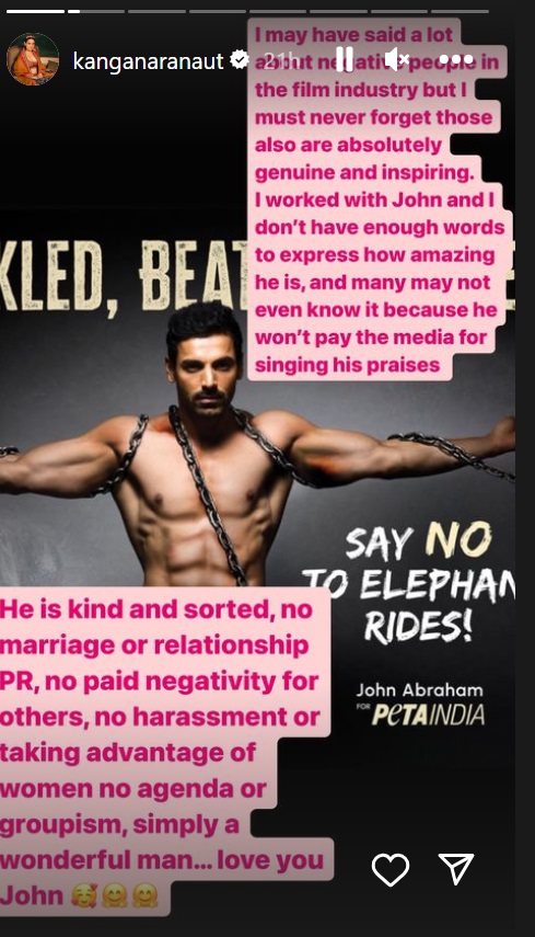 कंगना हिने सोशल मीडियावर एक पोस्ट शेअर केली आहे. पोस्ट शेअर करत अभिनेत्रीने जॉन अब्राहम याचं कौतुक केलं आहे. ‘मी आतापर्यंत फिल्म इंडस्ट्रीमधील अनेक लोकांबद्दल नकारात्मक प्रतिक्रिया दिली आहे. पण जे प्रेरणादायी आणि सज्जन आहे, त्यांना विसरून चालणार नाही.’