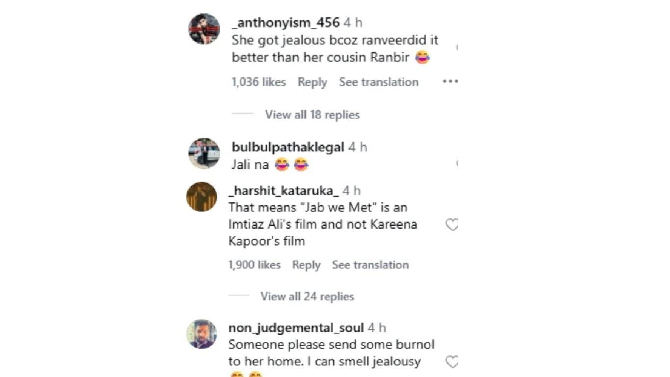 करीना कपूरच्या या वक्तव्यावर आता नेटकरी विविध प्रतिक्रिया देत आहेत. काहींनी तिच्या मताशी सहमती दर्शवली आणि या चित्रपटाच्या मागे दिग्दर्शकाची अधिक मेहनत होती, असं म्हटलं. तर काहींनी करीनावर पक्षपातीचा आरोप केला. ‘हिलासुद्धा धुरंधरचं यश पचलं नाही वाटतं. तिने रणवीर सिंहच्या मेहनतीकडे पूर्णपणे दुर्लक्ष केलं आहे’, असं नेटकऱ्यांनी लिहिलं आहे. काहींनी करीनाला टोला लगावत म्हटलंय, ‘मग तर जब वी मेटसुद्धा इम्तियाज अलीचा चित्रपट आहे, करीनाचा नाही. या हिशोबाने रामायणसुद्धा फक्त नितेश तिवारी यांचा चित्रपट आहे, रणबीर कपूरचा नाही.’ अनेकांनी बॉलिवूडमध्ये असलेल्या रणवीर-रणबीर यांच्यातील तुलनेकडे लक्ष वेधलंय. “रणवीरला रणबीरच्या तुलनेत सर्वोत्कृष्ट अभिनेता म्हटलं जातं, म्हणून ईर्षेतून तिने हे वक्तव्य केलंय”, असं नेटकऱ्यांनी म्हटलंय.