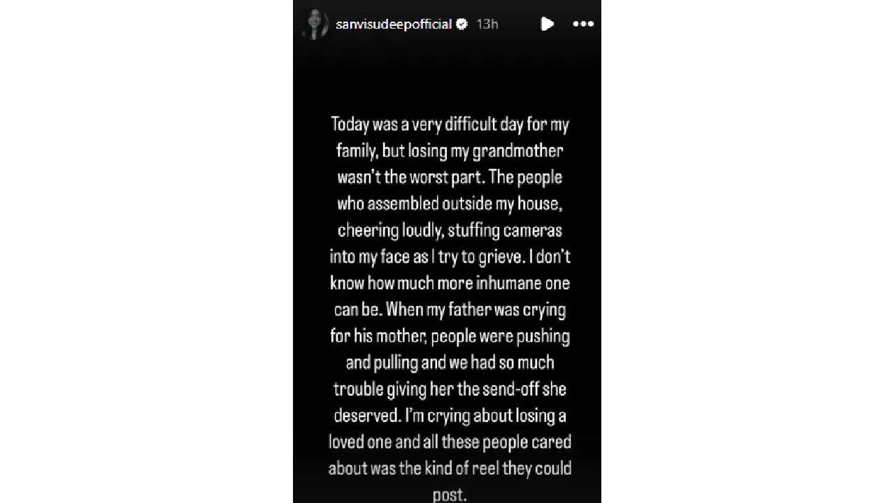 सानवीने तिच्या इन्स्टाग्राम स्टोरीमध्ये आजी सरोजा यांच्यासोबतचा फोटो पोस्ट केला. या फोटोसोबत तिने लिहिलं, ‘मी तुझ्यावर नेहमी खूप प्रेम करेन.’ यानंतर आजीच्या अंत्यविधीदरम्यान नेमकं काय घडलं, याविषयी तिने पोस्टमध्ये संताप व्यक्त केला. ‘आजचा दिवस माझ्या कुटुंबासाठी खूप कठीण होता. पण माझ्या आजीला गमावणं हा आजच्या दिवसातील सर्वांत वाईट भाग नव्हता. तर लोक माझ्या घराबाहेर जमले होते, जोरजोराने शिट्ट्या वाजवत होते, माझ्या तोंडावर कॅमेरे धरत होते.. हा सर्वांत वाईट भाग होता. एखादी व्यक्ती अजून किती अमानुष वागू शकते मला माहीत नाही’, अशा शब्दांत तिने तीव्र नाराजी बोलून दाखवली.