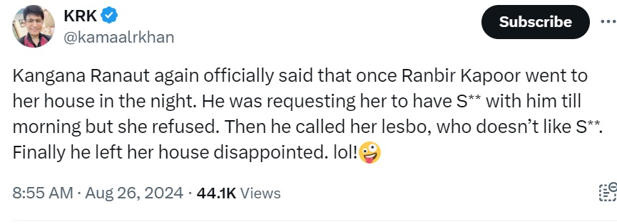 अभिनेत्री आणि खासदार कंगना रनौत कायम त्यांच्या वादग्रस्त वक्तव्यांमुळे चर्चेत असतात. नेहमी वादाचा मुकूट डोक्यावर घेवून मिरवणाऱ्या कंगना आता एका ट्विटमुळे चर्चेत आल्या आहे. सध्या चर्चेत असलेलं ट्विट हे कंगना रनौत आणि अभिनेता रणबीर कपूर यांच्या संबंधित आहे. कंगना – रणबीर संबंधित ट्विट करणारा अभिनेता दुसरा तिसरा कोणी नाही तर, अभिनेता कमाल आर खान म्हणजे केआरके आहे. ट्विटमध्ये केआरके याने वादग्रस्त वक्तव्य केलं आहे मध्यरात्री कंगना यांच्या घरी जावून रणबीर याने अभिनेत्रीकडे नको ती मागणी केली… असं ट्विटमध्ये म्हटलं आहे.