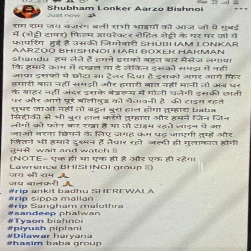 शुभम लोंकर आरजू बिश्नोई याने शेअर केलेल्या पोस्टमध्ये लिहिलं आहे की, ‘राम राम जय बजरंग बली सर्व भावांना.. आज मुंबईमध्ये (शेट्टी टॉवर) सिनेमा दिग्दर्शक रोहित शेट्टी याच्या घरावर गोळीबार झाला, त्याची जबाबदारी शुभम लोंकर आरजू बिश्नोई आणि हरी बॉक्सर हरमन संधू घेत आहे. आम्ही त्याला (रोहित शेट्टी) अनेकदा मेसेज केला की, आमच्या कामामध्ये येवू नकोस… पण त्याला कळलं नाही… आता त्याला हे कळंल नाही तर, पुढे त्याच्या घरावर नाही तर, बेडरुममध्ये गोळीबार करु… ही संपूर्ण बॉलिवूडला चेतावनी आहे…’