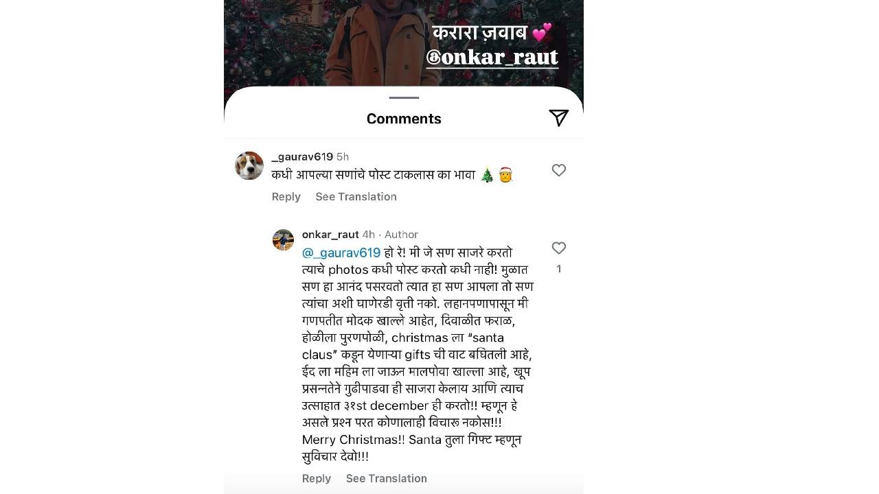 ‘कधी आपल्या सणांचे फोटो पोस्ट टाकलास का भावा,’ असा सवाल करणाऱ्या युजरला ओंकारने सडेतोड उत्तर दिलं आहे. त्याने लिहिलं, ‘हो रे, मी जे सण साजरे करतो त्याचे फोटो कधी पोस्ट करतो तर कधी नाही. मुळात सण हा आनंद पसरवतो. त्यात हा सण आपला तो सण त्यांचा अशी घाणेरडी वृत्ती नको. लहानपणापासून मी गणपतीत मोदक खाल्ले आहेत, दिवाळीत फराळ, होळीला पुरणमोळी, ख्रिसमसला सांताक्लॉजकडून येणाऱ्या गिफ्ट्सची वाट बघितली आहे, ईदला माहिमला जाऊन मालपोवा खाल्ला आहे, खूप प्रसन्नतेनं गुढीपाडवा साजरा केलाय आणि त्याच उत्साहास 31 डिसेंबरही साजरा करतोय. म्हणून हे असले प्रश्न परत कोणालाही विचारू नकोस, मेरी ख्रिसमस. सांता तुला गिफ्ट म्हणून सुविचार देवो’.