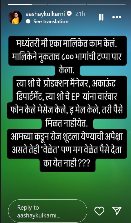 आशय कुलकर्णी इन्स्टाग्राम स्टोरीवर पोस्ट करत म्हणाला, ‘मध्यंतरी मी एका मालिकेत काम केलं. मालिकेने नुकताच 800 भागांचा टप्पा पार केला. त्या शोचे प्रॉडक्शन मॅनेजर. अकाऊंट डिपार्टमेंट, त्या शोचे EP यांनी वारंवार फोन केले मेसेज कले, ई-मेल कले, तरी पैसे मिळत नाहीयेत…’