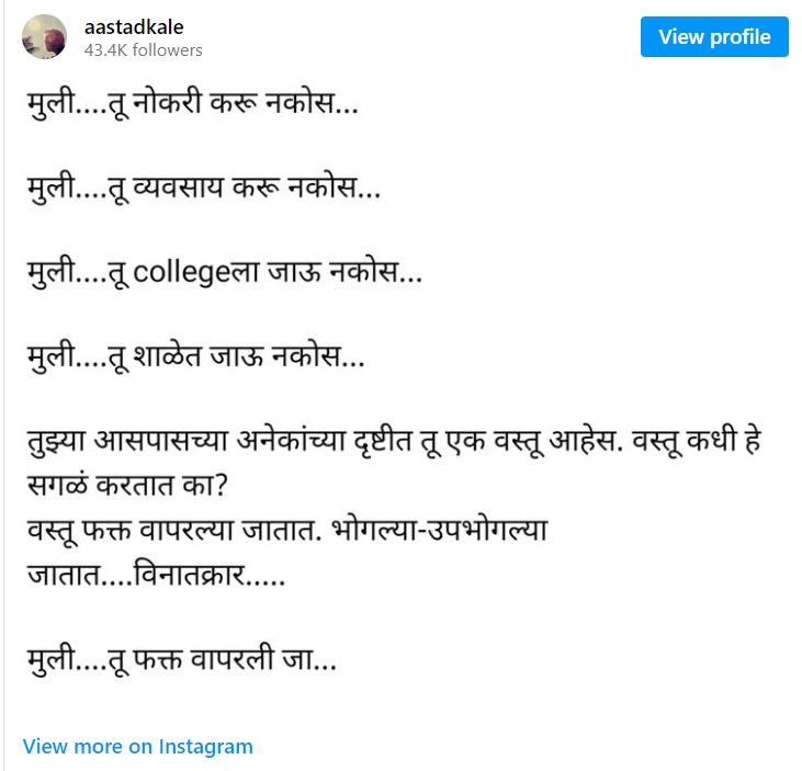 याआधी देखील अनेक सेलिब्रिटींनी सोशल मीडियाच्या माध्यमातून संताप व्यक्त केला आहे. तुझ्या आसपासच्या अनेकांच्या दृष्टीत तू एक वस्तू आहेस. वस्तू कधी हे सगळं करतात का? वस्तू फक्त वापरल्या जातात. भोगल्या-उपभोगल्या जातात…विनातक्रार…मुली…तू फक्त वापरली जा…’ अशी पोस्ट करत अभिनेता आस्ताद काळे याने संताप व्यक्त केला होता.