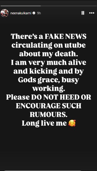 निधनाच्या अफवांचं खंडन करत नीना कुळकर्णी म्हणाल्या, ‘माझ्या निधनाची यूट्यूबवर पसरत असलेली बातमी खोटी आहे. मी जिवंत आहे आणि स्वस्थ आहे. देवाच्या कृपाने कामात व्यस्त आहे. अशा बातम्यांना कृपया प्रोत्साहन देऊ नका.. त्याकडे दुर्लक्ष करा… मला दीर्घायुष्य मिळो…’ असं नीना कुळकर्णी सोशल मीडिया पोस्टमध्ये म्हणाल्या आहेत.