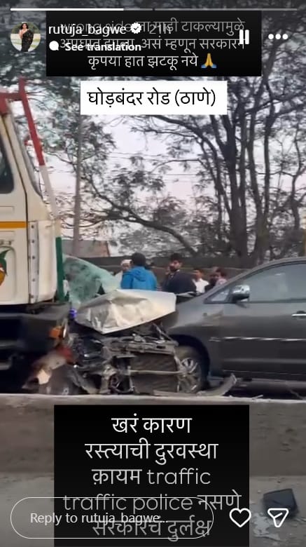 अभिनेत्री ऋतुजा बागवे हिने अपघाताचा व्हिडीओ इन्स्टाग्राम स्टोरीवर पोस्ट केला आहे. अतिशय भयानक असा हा अपघात असल्याचं दिसत आहे. अभिनेत्रीने शेअर केलेला व्हिडीओ पाहिल्यानंतर असं दिसून येत आहे की, घोडबंदरहून ठाण्याच्या दिशेने अवजड वाहने जात असताना काही हलकी वाहने विरुद्ध दिशेने येत होती. अशात नियंत्रण सुटल्यामुळे गंभीर अपघात झाला…