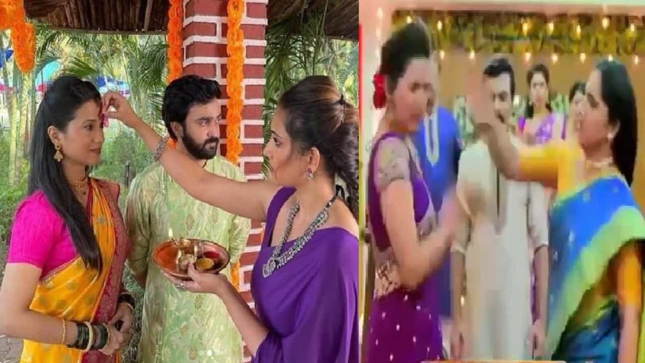 (Marathi TV Serial Aai Kuthe Kay Karte Arundhati slaps Sanjana during Abhi Anagha engagement as Ankita enters)