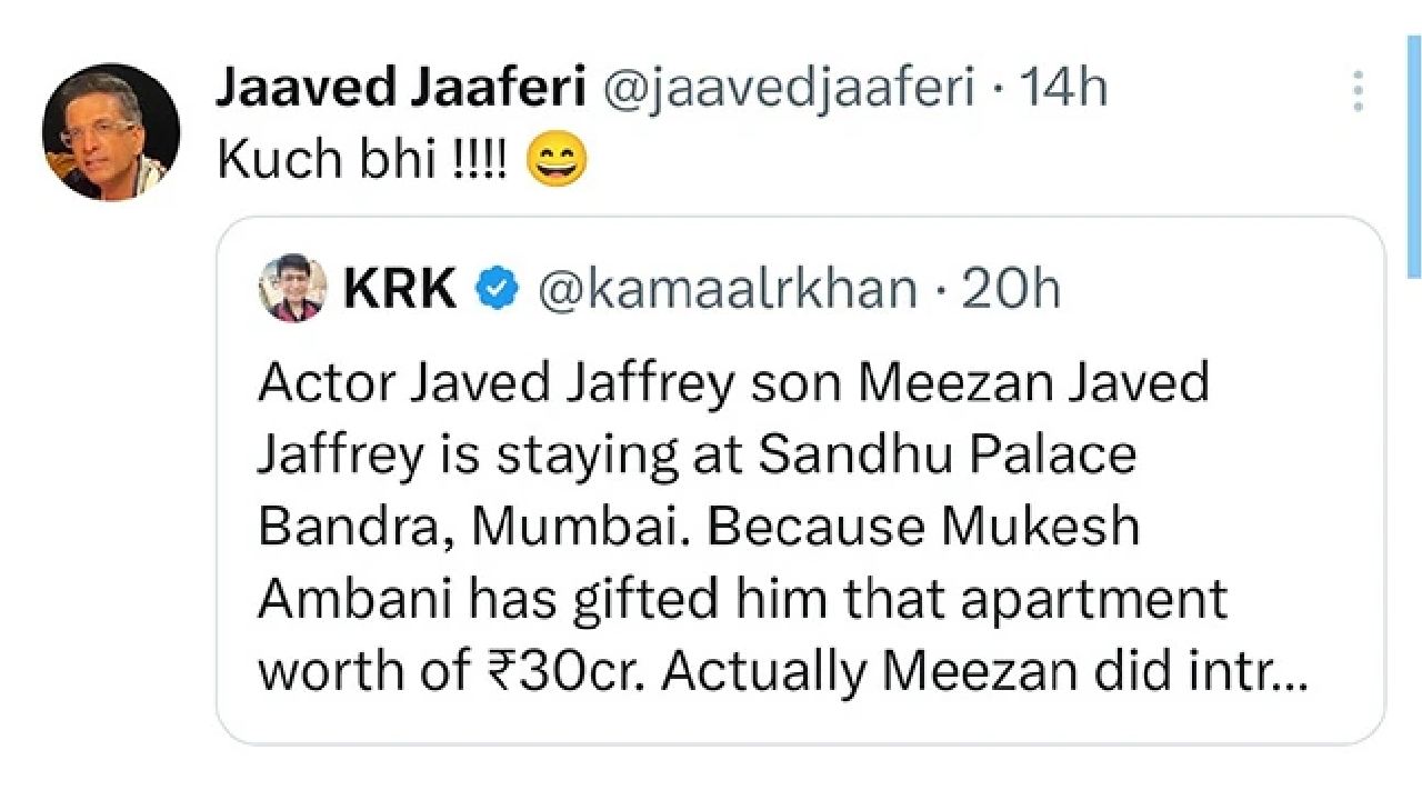 केआरकेनं केलेल्या या दाव्यावरून सोशल मीडियावर जोरदार चर्चा सुरू झाली. त्यावर आता मिजानच्या वडिलांनी म्हणजेच जावेद जाफरीने प्रतिक्रिया दिली आहे. जावेदने केआरकेच्या पोस्टवर हसण्याचे इमोजी शेअर करत लिहिलं, ‘काहीही!’ या ट्विटनंतर नेटकरी केआरकेची खिल्ली उडवू लागले. ‘तू अजून पण फॉरवर्ड मेसेजवर विश्वास ठेवतोस का’, असा सवाल नेटकऱ्यांनी त्याला केला.