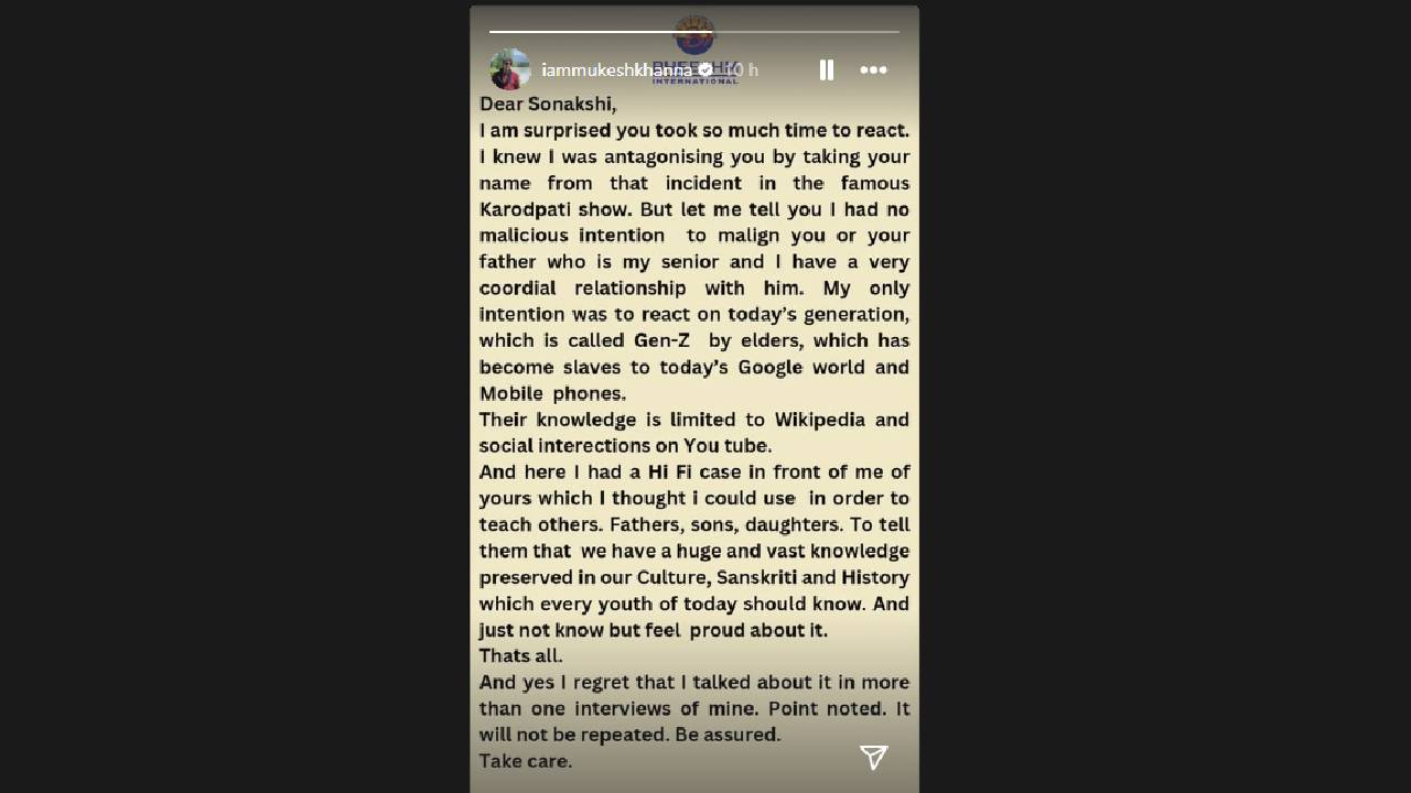 2019 मध्ये अमिताभ बच्चन यांच्या ‘कौन बनेगा करोडपती’ या शोच्या एका एपिसोडमध्ये अभिनेत्री सोनाक्षी सिन्हाला रामायणाशी संबंधित एका प्रश्नाचं उत्तर देता आलं नाही. या घटनेला आता पाच वर्षे उलटल्यानंतर त्यावरून एक वेगळं ‘रामायण’ सुरू झालं आहे, असं म्हणायला हरकत नाही. यामागचं कारण म्हणजे ‘शक्तीमान’ फेम मुकेश खन्ना यांनी वारंवार विविध मुलाखतींमध्ये केलेला सोनाक्षीचा अपमान. इतकंच काय तर त्यांनी तिच्या संगोपनावरही प्रश्न उपस्थित केला. अखेर संयमाचा बांध सुटलेल्या सोनाक्षीने तिच्या इन्स्टा स्टोरीमध्ये भलीमोठी पोस्ट लिहित मुकेश खन्ना यांना सुनावलं. ‘पुढच्या वेळी माझ्या वडिलांनी माझ्यात जी मूल्ये रुजवली आहेत, त्याबद्दल तुम्ही काही बोलायचं ठरवाल तेव्हा कृपया लक्षात ठेवा की त्या मूल्यांमुळेच मी आज अत्यंत आदराने हे सगळं बोलतेय,’ असं तिने या पोस्टमध्ये म्हटलं होतं. त्यानंतर आता मुकेश खन्ना यांनी सोनाक्षीसाठी पोस्ट लिहिली आहे. त्याचप्रमाणे यापुढे तिचा किस्सा ते कोणत्याही मुलाखतीत पुन्हा सांगणार नाहीत, याचं आश्वासन त्यांनी दिलंय.