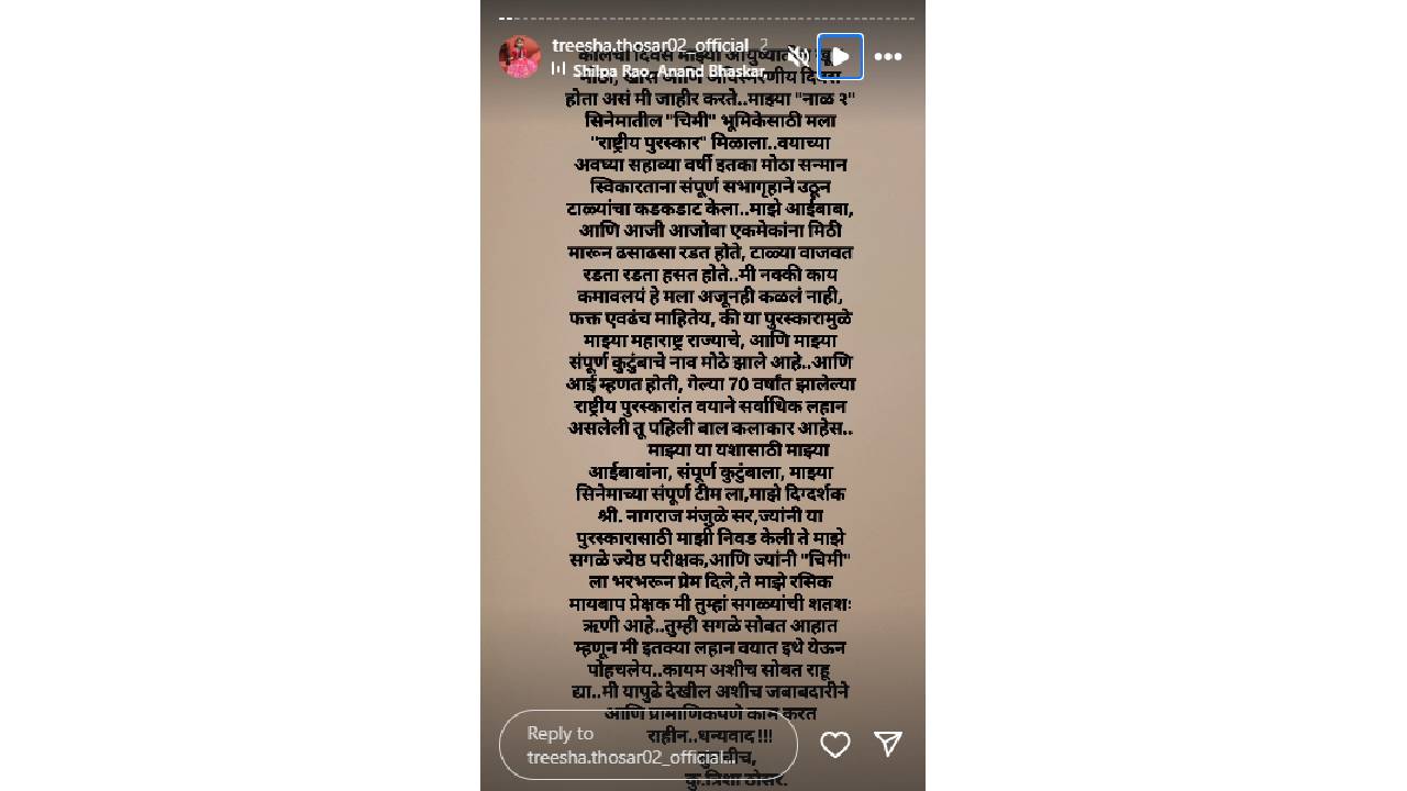 ‘माझ्या या यशासाठी माझ्या आईबाबांना, संपूर्ण कुटुंबाला, माझ्या चित्रपटाच्या संपूर्ण टीमला, माझे दिग्दर्शक नागराज मंजुळे सर, ज्यांनी या पुरस्कारासाठी माझी निवड केली ते माझे सगळे ज्येष्ठ परीक्षक आणि ज्यांनी ‘चिमी’ला भरभरून प्रेम दिलं, ते माझे रसिक मायबाप प्रेक्षक.. मी तुम्हा सगळ्यांची शतश: ऋणी आहे. तुम्ही सगळे सोबत आहात म्हणून मी इतक्या लहान वयात इथे येऊन पोहोचलेय. कायम अशीच सोबत राहू द्या. मी यापुढे देखील अशीच जबाबादारीने आणि प्रामाणिकपणे काम करत राहीन,’ असं ती पुढे म्हणाली.