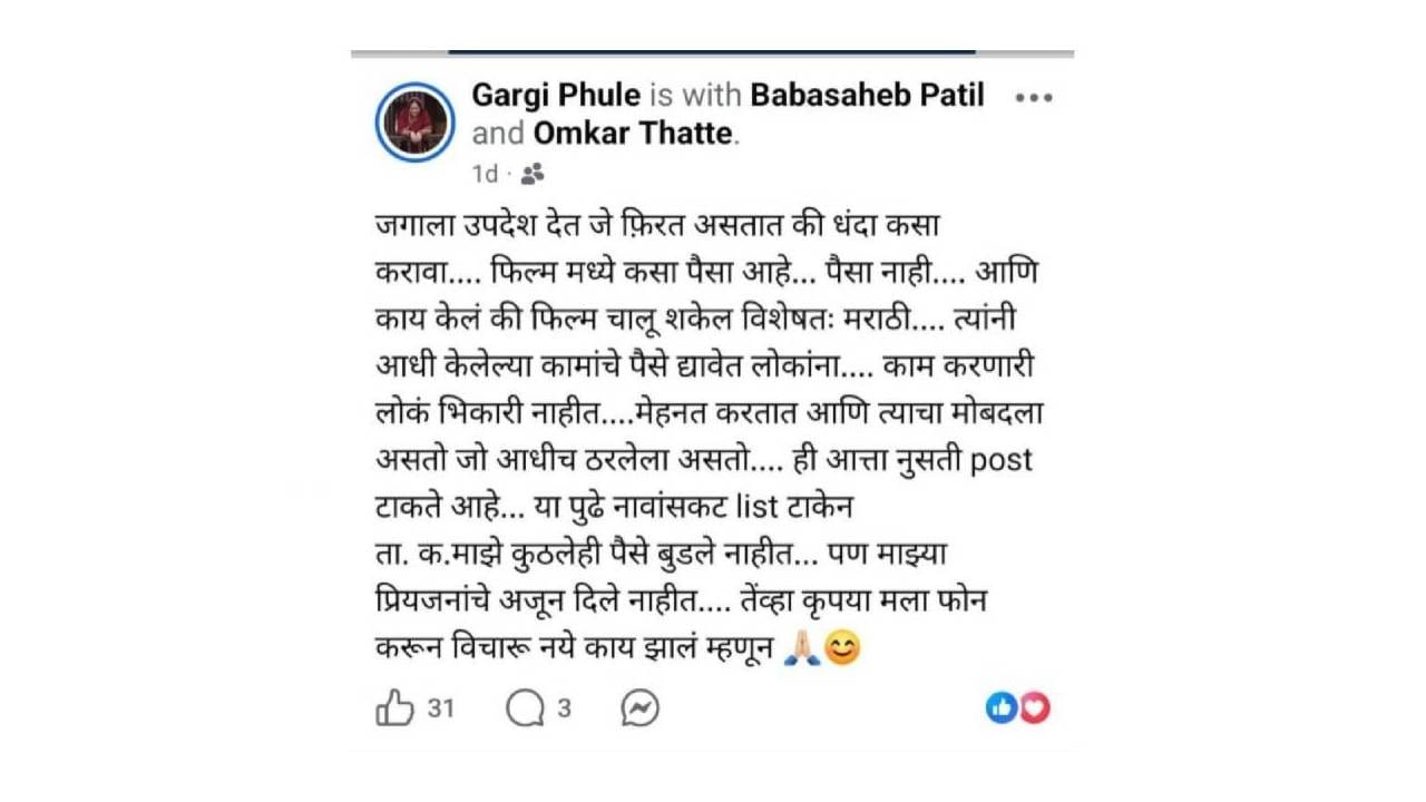 प्रेक्षकांच्या मनोरंजनासाठी कलाकार दिवस-रात्र राबतात आणि अनेकदा त्यांना त्यांच्या मेहनतीचे पैसेसुद्धा वेळेवर मिळत नाही. याआधी अनेक कलाकारांनी याप्रकरणी आवाज उठवला आहे. अशातच दिवंगत अभिनेते निळू फुले यांची कन्या आणि अभिनेत्री गार्गी फुले यांच्या फेसबुक पोस्टने सर्वांचं लक्ष वेधलंय. गार्गी यांनी त्यांच्या फेसबुक अकाऊंटवर याचसंदर्भात एक पोस्ट लिहिली असून पुढच्या वेळी नावांसह यादीच टाकेन, अशा इशारा दिला आहे. जगाला उपदेश देत फिरण्यापेक्षा आधी लोकांनी केलेल्या कामांचे पैसे त्यांना द्यावेत, असंही त्यांनी म्हटलंय. यावळी गार्दी फुले यांनी असंही स्पष्ट केलंय की त्यांचे कुठलेही पैसे बुडाले नाहीत, पण त्यांच्या प्रियजनांबाबत हे घडलंय.