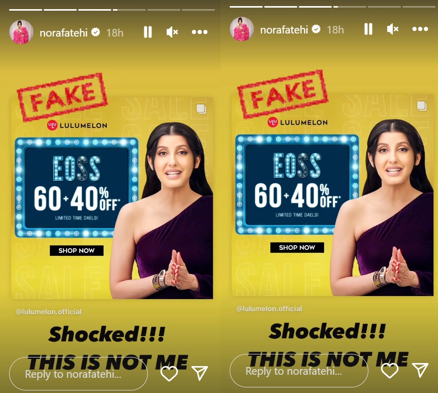 व्हिडीओमध्ये ‘लुलुमेलोन’ नावाचा एक फॅशन ब्रँड दिसत आहे. त्या फॅशन ब्रँडला नोरा प्रमोट करताना दिसत आहे. व्हिडीओमध्ये नोरा हिचा फोटो लागला आहे. शिवाय 60-40 टक्के सूट असल्याचं देखील सांगितलं जात आहे. आता अभिनेत्रीने तिच्या इंस्टाग्राम हँडलवर एक स्टोरी शेअर केली आहे. नोरा फतेहीने व्हिडिओ शेअर करताना फेक असल्याचे म्हटले आहे.