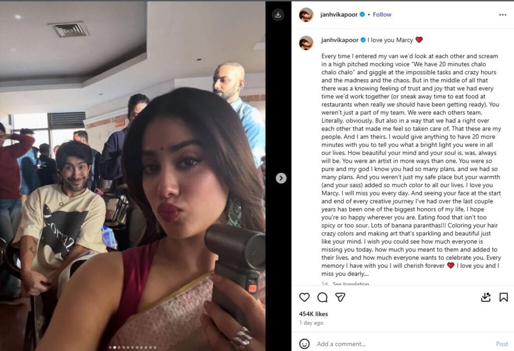 मार्से पेड्रोजो यांच्या निधनानंतर शोक व्यक्त करत जान्हवी म्हणाली, ‘आय लव्ह मार्से… ज्याप्रकारे मी माझ्या वॅनिटीमध्ये प्रवेश करायचे आणि आपण एकमेकांना पाहून मोठ्याने किंचाळायचो आणि म्हणायचो आपल्याकडे फक्त 20 मिनिटं आहेत… ती अशक्य वाटणारी कामं, कामाचे वेडेवाकडे तास, तो सगळा गोंधळ, हे सगळंच खूप छान होतं. त्या सगळ्या गोंधळातही, जेव्हा जेव्हा आम्ही एकत्र काम करायचो, तेव्हा मला विश्वासाची आणि आनंदाची भावना जाणवायची. तू माझ्या टीमचा फक्त एक भाग नव्हतास तर, आम्ही दोघे एकमेकांची टीम होतो…’ असं म्हणत जान्हवी हिने दुःख व्यक्त केले.